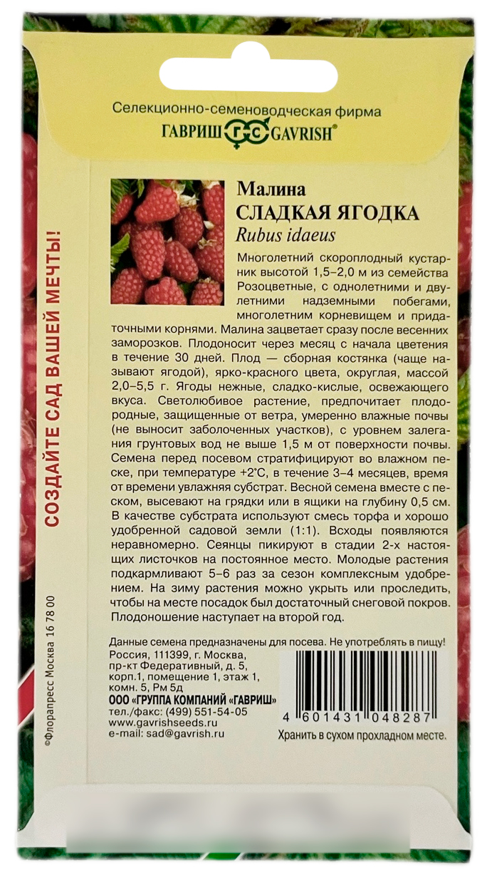 Малина СЛАДКАЯ ЯГОДКА ГАВРИШМноголетний скороплодный кустарник высотой 1,5-2,0 м из семейства Розоцветные, с однолетними и двулетними надземными побегами, многолетним корневищем и придаточными корнями. Малина зацветает сразу после весенних заморозков. Плодоносит через месяц с начала цветения в течение 30 дней. Плод — сборная костянка (чаще называют ягодой), ярко-красного цвета, округлая, массой 2,0-5,5 г. Ягоды нежные, сладко-кислые, освежающего вкуса. Светолюбивое растение, предпочитает плодородные, защищенные от ветра, умеренно влажные почвы (не выносит заболоченных участков), с уровнем залегания грунтовых вод не выше 1,5 м от поверхности почвы.