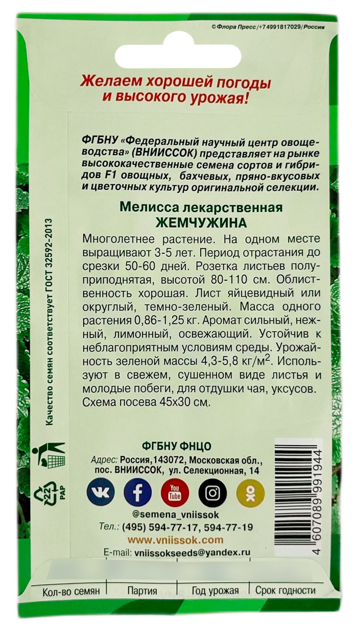 Мелисса лекарственная ЖЕМЧУЖИНА ВНИИССОКМноголетнее растение высотой 80-110 см. На одном месте выращивается 3-5 лет. Период от отрастания до срезки листьев (на второй год вегетации) 50-60 дней. Розетка листьев полуприподнятая, число побегов 25-70. Облиственность хорошая. Лист короткочерешковый, среднего размера, яйцевидный или округлый, по краям зубчатый, тёмно-зелёный. Масса одного растения 0,86-1,16 кг. Аромат сильный, нежный, освежающий, лимонный. Урожайность зелени 4,3-5,8 кг/м2.