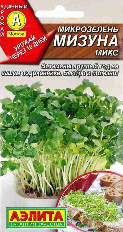 Микрозелень – молодые растения в фазе первой пары настоящих листьев. Срезаются через 10 дней после всходов. Содержат максимальное количество витаминов, микроэлементов, минеральных солей, каратиноидов и белков. Значительно полезней чем взрослые растения. Улучшат и разнообразят рацион. В состав cмеси входят горчица листовая МИЗУНА РЕД и горчица листовая МИЗУНА ЛАЙМ. Растения неприхотливые, быстро растущие. Сочная зелень с приятным нежно-пряным вкусом. Для выращивания микрозелени используют различные низкие широкие ёмкости. Насыпают субстрат (грунт для рассады или комнатных растений) на 2/3 высоты, проливают и слегка уплотняют. Семена равномерно распределяют по поверхности, затем присыпают тонким слоем субстрата и еще раз уплотняют. Хорошо увлажняют из опрыскивателя. Накрывают стеклом или целлофаном для сохранения влажности до всходов. Посевы проводят круглогодично, раз в 10-15 дней.Характеристики