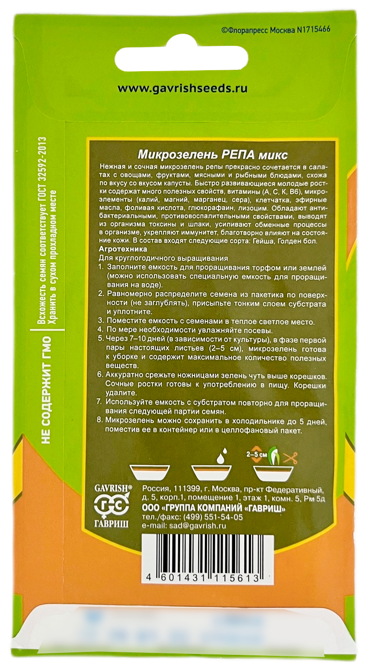 Микрозелень РЕПА МИКСНежная и сочная микрозелень репы прекрасно сочетается в салатах с овощами, фруктами, мясными и рыбными блюдами, схожа по вкусу со вкусом капусты. Быстро развивающиеся молодые ростки содержат много полезных свойств, витамины (А, С, К, В6), микроэлементы (калий, магний, марганец, сера), клетчатка, эфирные масла, фолиевую кислоту, глюкорафаин, лизоцим. Обладают антибактериальными, противовоспалительными свойствами, выводят из организма токсины и шлаки, усиливают обменные процессы в организме, укрепляют иммунитет, благотворно влияют на состояние кожи. В состав входят следующие сорта: Гейша, Голден бол.