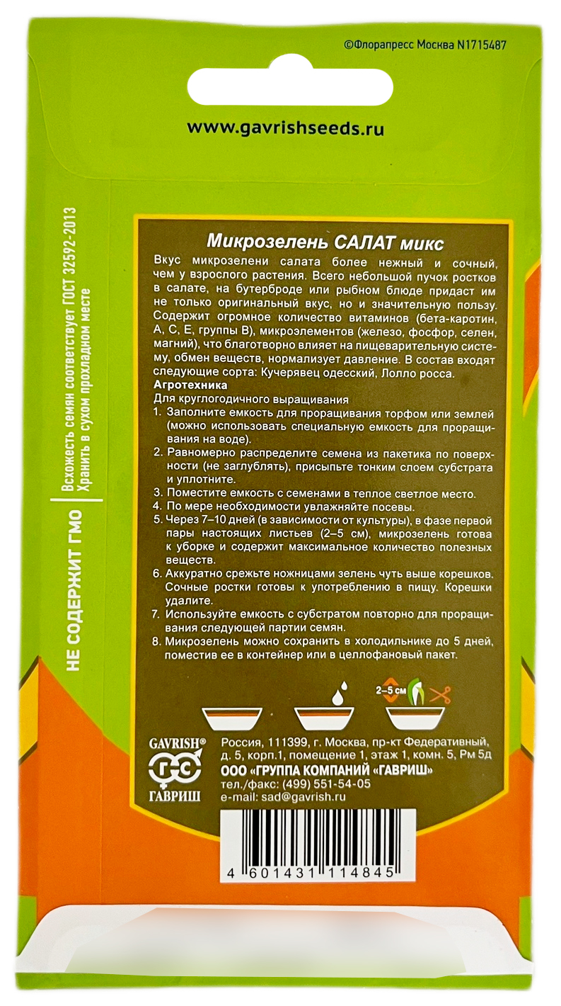 Микрозелень на окне САЛАТ МИКС bio greensВкус микрозелени салата более нежный и сочный, чем у взрослого растения. Всего небольшой пучок ростков в салате, на бутерброде или рыбном блюде придаст им не только оригинальный вкус, но и значительную пользу. Содержит огромное количество витаминов (бета-каротин, А, С, Е, группы В), микроэлементов (железо, фосфор, селен, магний), что благотворно влияет на пищеварительную систему, обмен веществ, нормализует давление. В состав входят следующие сорта: Салат Кучерявец Одесский - 50% Салат Лолло Росса - 50%