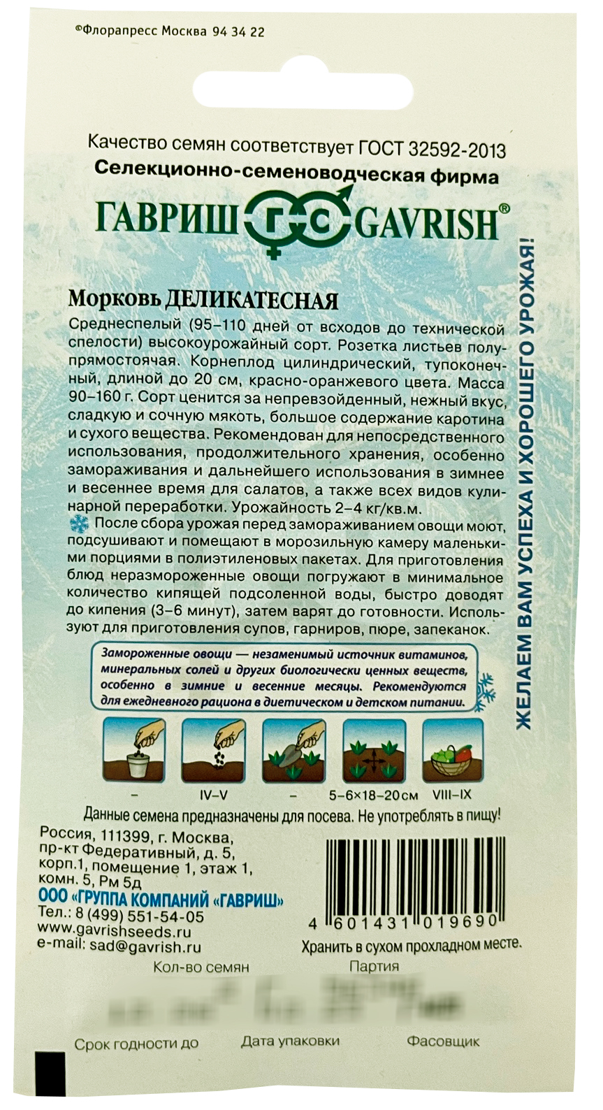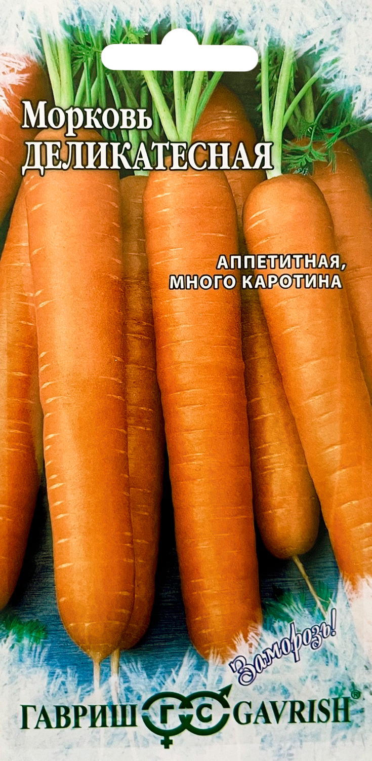 Морковь Деликатесная серия Заморозь!Среднеспелый (95-110 дней от всходов до технической спелости) высокоурожайный сорт. Розетка листьев полупрямостоячая. Корнеплод цилиндрический, тупоконечный, длиной до 20 см, красно-оранжевого цвета. Масса 90 - 160 г. Сорт ценится за непревзойденный, нежный вкус, сладкую и сочную мякоть, большое содержание каротина и сухого вещества. Рекомендован для непосредственного использования, продолжительного хранения, особенно замораживания и дальнейшего использования в зимнее и весеннее время для салатов, а также всех видов кулинарной переработки. Урожайность 2 - 4 кг/м2.