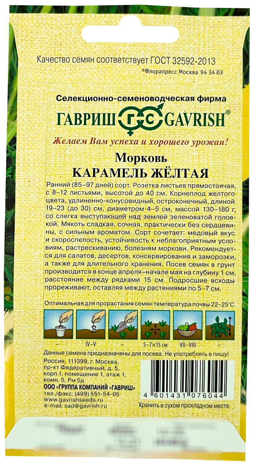 Морковь Карамель желтая 150 штРанний (85-97 дней) сорт. Розетка листьев прямостоячая, с 8-12 листьями, высотой до 40 см. Корнеплод желтого цвета, удлиненно-конусовидный, остроконечный, длиной 19-23 (до 30) см, диаметром 4-5 см, массой 130-180 г, со слегка выступающей над землей зеленоватой головкой. Мякоть сладкая, сочная, практически без сердцевины, с сильным ароматом. Сорт сочетает: медовый вкус и скороспелость, устойчивость к неблагоприятным условиям, растрескиванию, болезням моркови. Рекомендуется для салатов, десертов, консервирования и заморозки, а так же для длительного хранения. Посев семян в грунт производится в конце апреля–начале мая на глубину 1 см, расстояние между рядками 15 см. Подросшие всходы прореживают, оставляя между растениями по 5-7 см.