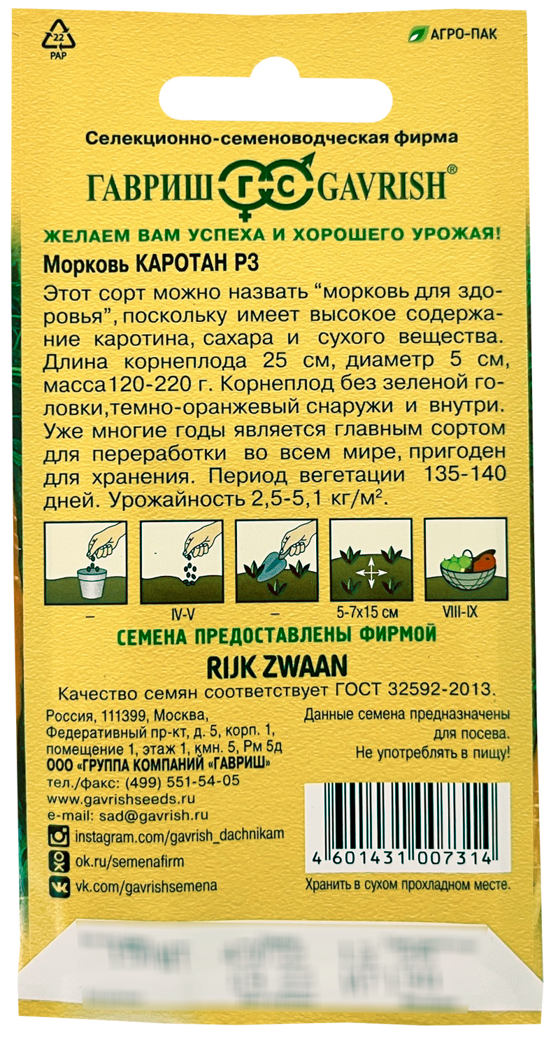 Морковь Каротан РЗ ГАВРИШЭтот сорт можно назвать "морковь для здоровья", поскольку имеет. высокое содержание каротина, сахара и сухого вещества. Длина корнеплода 25 см, диаметр 5 см. Корнеплод без зеленой головки, яркий оранжево-красный снаружи и внутри. Уже многие годы является главным сортом для переработки во всем мире, пригоден для хранения. Период вегетации 135-140 дней.