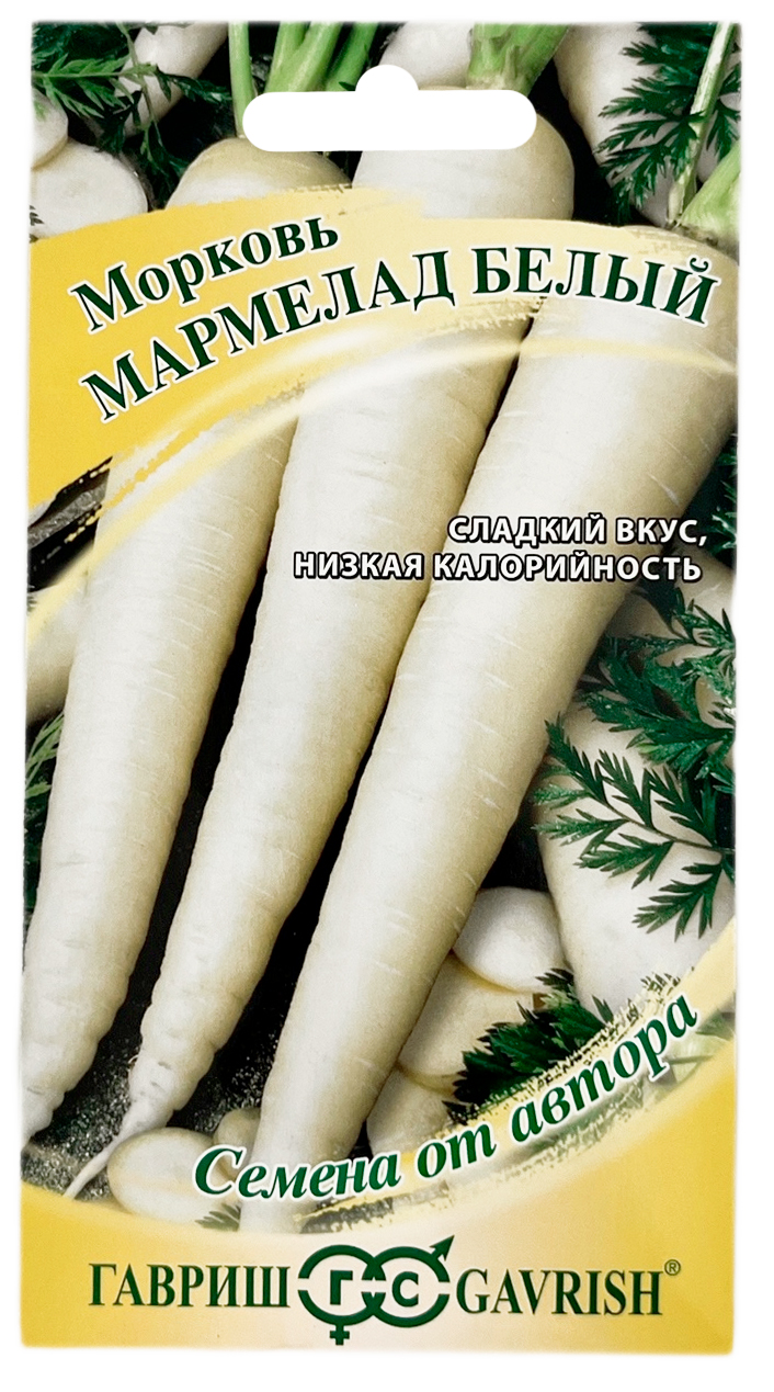 Морковь Мармелад белый ГАВРИШМорковь белого оттенка является уникальным селекционным овощем, который всё больше завоевывает поклонников в нашей стране. Отличается высокой урожайностью, отменными вкусовыми качествами и низкой калорийностью. Имеет широкое применение в диетическом питании. Среднеспелый (105-110 дней) урожайный сорт. Корнеплод удлиненно-конический, кремово-белого цвета, длиной 17-22 см, с выступающей над землей зеленоватой головкой. Масса корнеплодов 180-250 г (до 400 г и более в зависимости от условий выращивания). Мякоть маслянистая, белая, сладкая, хрустящая и ароматная. Яркие, крупные корнеплоды хорошо и долго хранятся до мая. Рекомендуются для приготовления свежих салатов, витаминных соков, разноцветной нарезки, запеканок. Посев семян в грунт производится в конце апреля–начале мая на глубину 1 см, расстояние между рядками 15 см. Подросшие всходы прореживают, оставляя между растениями по 5–7 см.
