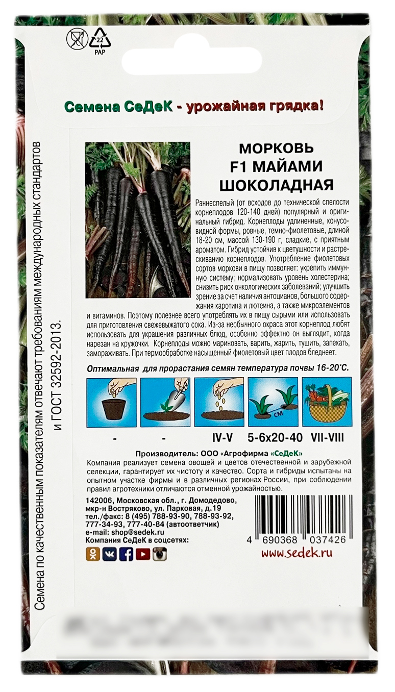 Морковь F1 Майами шоколадная СеДеКРаннеспелый (от всходов до технической спелости корнеплодов 120-140дней) популярный и оригинальный гибрид. Корнеплоды удлиненные, конусовидной формы, ровные, темно-фиолетовые, длиной 18-20см, массой 130-190г, сладкие, с приятным ароматом. Гибрид устойчив к цветушности и растрескиванию корнеплодов. Употребление фиолетовых сортов моркови в пищу позволяет: укрепить иммунную систему; нормализовать уровень холестерина; снизить риск онкологических заболеваний; улучшить зрение, за счет наличия антоцианов, большого содержания каротина и лютеина, а также микроэлементов и витаминов. Поэтому полезнее всего употреблять их в пищу сырыми или использовать для приготовления свежевыжатого сока. Из-за необычного окраса этот корнеплод любят использовать для украшения различных блюд, особенно эффектно он выглядит, когда нарезан на кружочки. Корнеплоды можно мариновать, варить, жарить, тушить, запекать, замораживать. При термообработке насыщенный фиолетовый цвет плодов бледнеет.