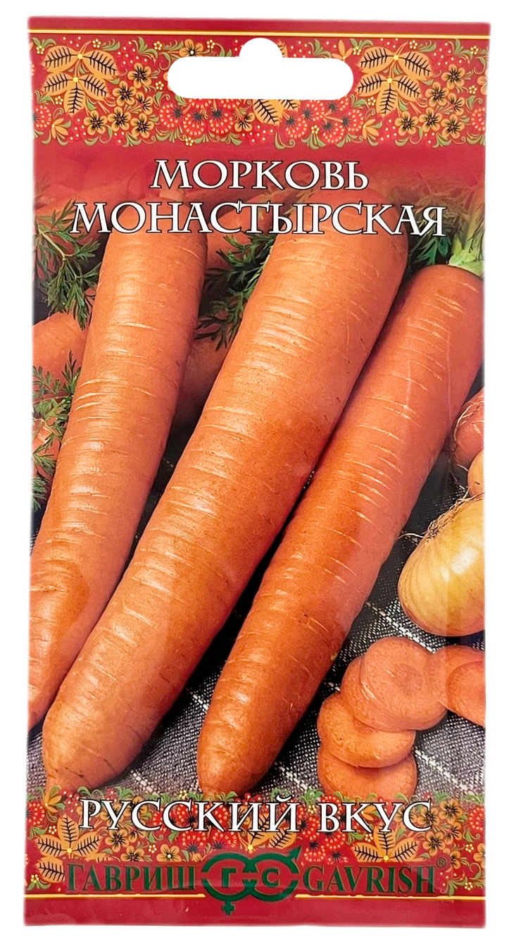 Морковь Монастырская Русский вкус ГАВРИШПозднеспелый (130-140 дней от всходов до технической спелости) сорт. Рекомендован для диетического и повседневного питания: приготовления соков, пюре, диетических морковных котлет и блинов, первых блюд и тушения с овощами, мясом. Посев семян в грунт производится в конце апреля – начале мая на глубину 1 см, расстояние между рядками 20 см. Подросшие всходы прореживают, оставляя между растениями по 5-7 см. Розетка листьев полустоячая. Корнеплод длиной до 25 см, диаметром 4-5 см, конический с вытянутым кончиком, круглой сердцевиной. Масса 140-220 г. Отличается высокой урожайностью, выравненностью корнеплодов, продолжительным хранением в течение зимнего периода. Урожайность 3,2-5,6 кг/м2.