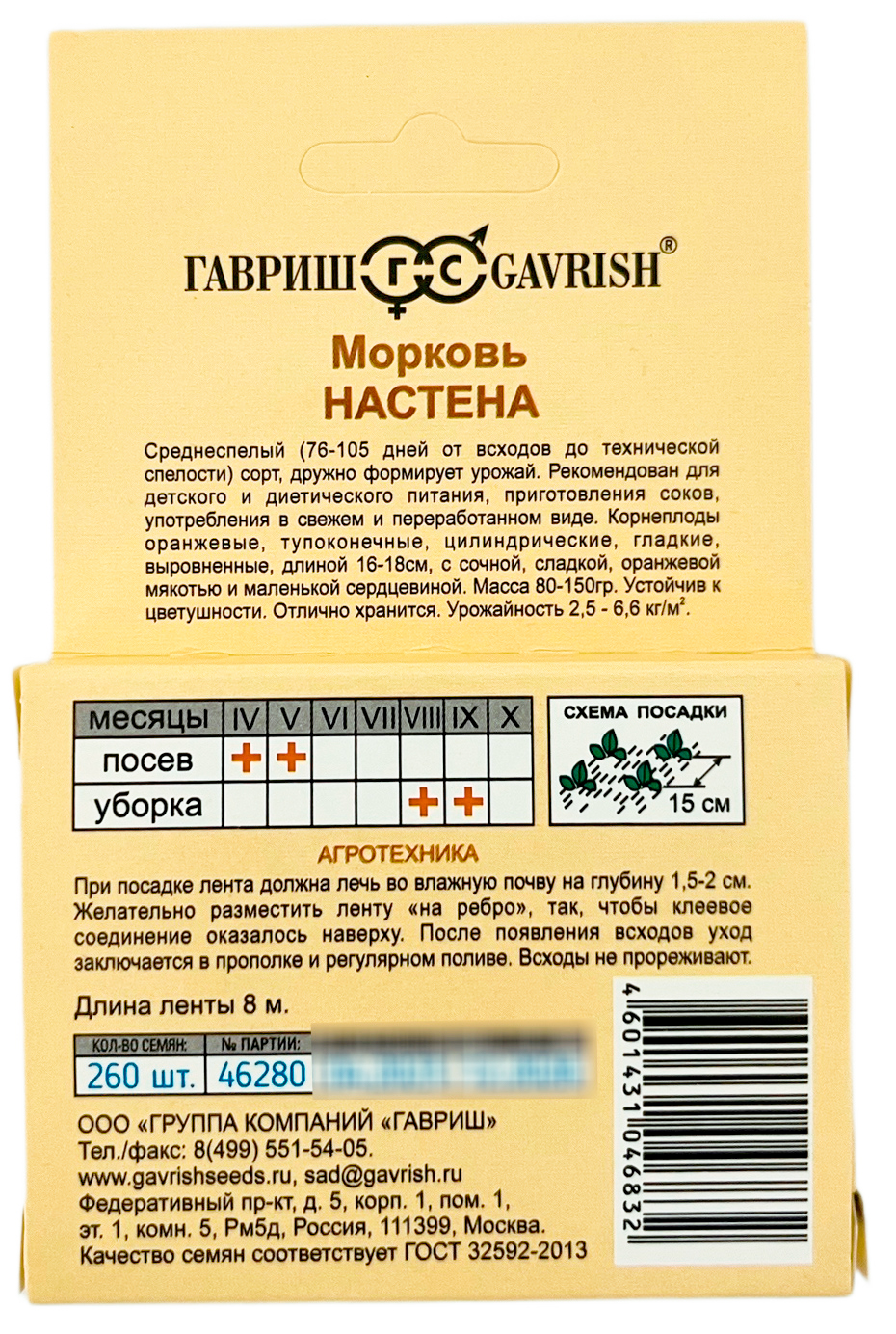 Морковь Настена, на ленте, 8м, ГавришСреднеспелый (76-105 дней от всходов до технической спелости) сорт, дружно формирует урожай. Рекомендован для детского и диетического питания, приготовления соков, употребления в свежем и переработанном виде. Посев семян в грунт производится в конце апреля – начале мая на глубину 1 см, расстояние между рядками 15 см. Подросшие всходы прореживают, оставляя между растениями по 5-7 см. Корнеплоды оранжевые, цилиндрические, тупоконечные, гладкие, выравненные, длиной 16-18 см, с сочной сладкой оранжевой мякотью и маленькой сердцевиной. Масса 80-150 г. Устойчив к цветушности. Отлично хранится. Урожайность 2,5-6,6 кг/м2.