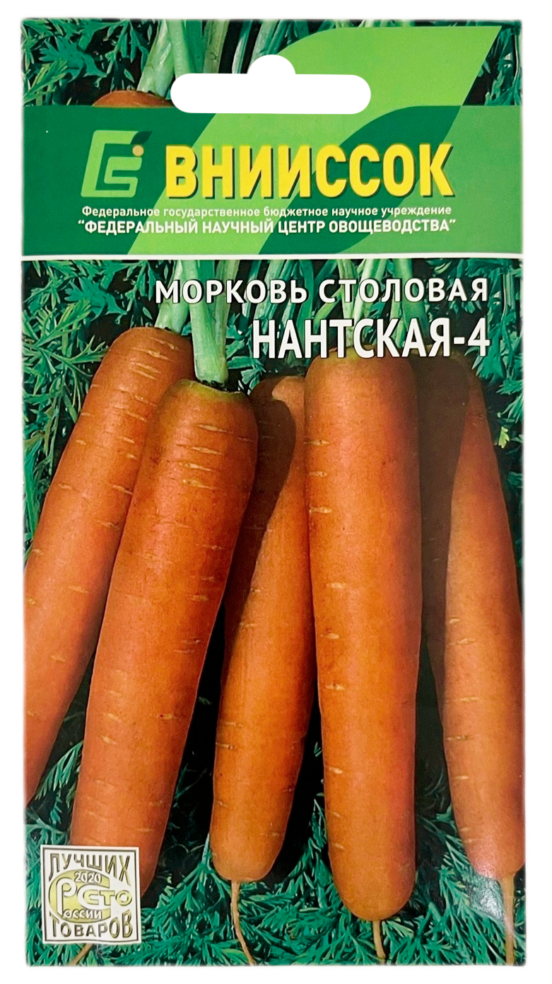 Морковь столовая НАНТСКАЯ-4 ВНИИССОКСреднеспелый (80-100 суток). Корнеплоды оранжевые цилиндрической формы, тупоконечные, массой 90-160 г с гладкой поверхностью, с зелёной или фиолетовой пигментацией головки. Мякоть – ярко-оранжевая, сочная, нежная, сладкая. Сердцевина маленькая, округлая. Урожайность 25-65 т/га, товарность – 78%. Содержание каротина в корнеплодах достигает 19,4 мг %. Корнеплоды идеальны для детского питания. Один из лучших сортов для подзимнего посева.