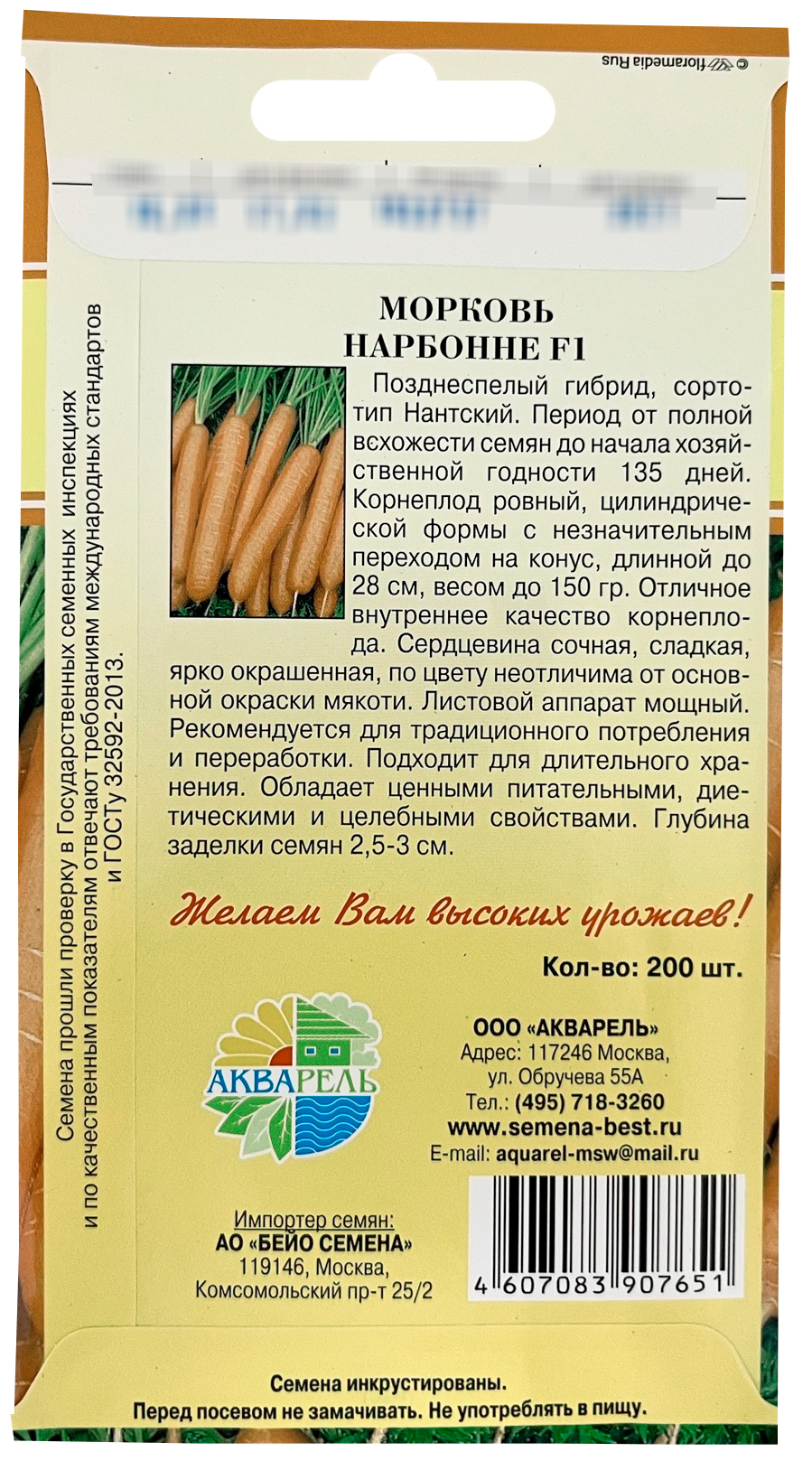 Морковь Нарбонне F1 АКВАРЕЛЬПозднеспелый гибрид, сортотип Нантский. Период от полной всхожести семян до начала хозяйственной годности 135 дней. Корнеплод ровный, цилиндрической формы с незначительным переходом на конус, длинной до 28 см, весом до 150 гр. Отличное внутреннее качество корнеплода. Сердцевина сочная, сладкая, ярко окрашенная, по цвету неотличима от основной окраски мякоти. Листовой аппарат мощный. Рекомендуется для традиционного потребления и переработки. Подходит для длительного хранения. Обладает ценными питательными, диетическими и целебными свойствами. Глубина заделки семян 2,5-3 см.