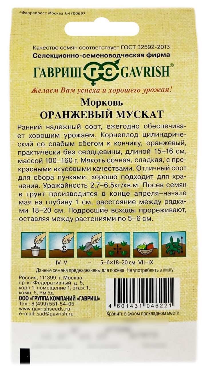 Морковь оранжевый МУСКАТ ГАВРИШРанний надежный сорт, ежегодно обеспечивает хорошим урожаем. Корнеплод цилиндрический со слабым сбегом к кончику, оранжевый, практически без сердцевины, длиной 15-16 см, массой 100-160 г. Мякоть сочная, сладкая, с прекрасными вкусовыми качествами. Отличный сорт для сбора пучками, хорошо подходит для хранения. Урожайность 2,7-6,5 кг/м2. Посев семян в грунт производится в конце апреля – начале мая на глубину 1 см, расстояние между рядками 18-20 см. Подросшие всходы прореживают, оставляя между растениями по 5-6 см.