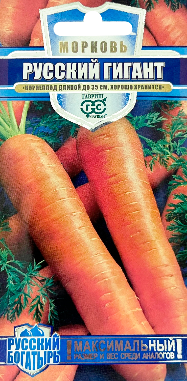 Морковь Русский гигант серия Русский богатырьПозднеспелый (130-135 дней от всходов до уборки урожая) сорт. Розетка листьев полустоячая. Корнеплод конический, тупоконечный, ярко-оранжевый, с небольшой сердцевиной, очень крупный, мощный, невероятно длинный. Средняя длина - 28 см, на легких плодородных почвах вырастает до 35 (!) см. Мякоть сочная, нежная, приятного вкуса. Масса 150-250 г. Корнеплод почти полностью погружен в почву. Сорт характеризуется высокой урожайностью, прекрасным внешним видом и выравненностью корнеплодов, предназначен для длительного хранения (до следующего урожая). Прекрасно подойдет для подзимних посевов. Посев семян в грунт производится в конце апреля &ndash, начале мая на глубину 1 см, расстояние между рядками 20 см. Подросшие всходы прореживают, оставляя между растениями по 6 см. Подзимний посев осуществляют осенью, в слегка промерзшую почву, увеличивая норму высева в 1,5-2,0 раза.