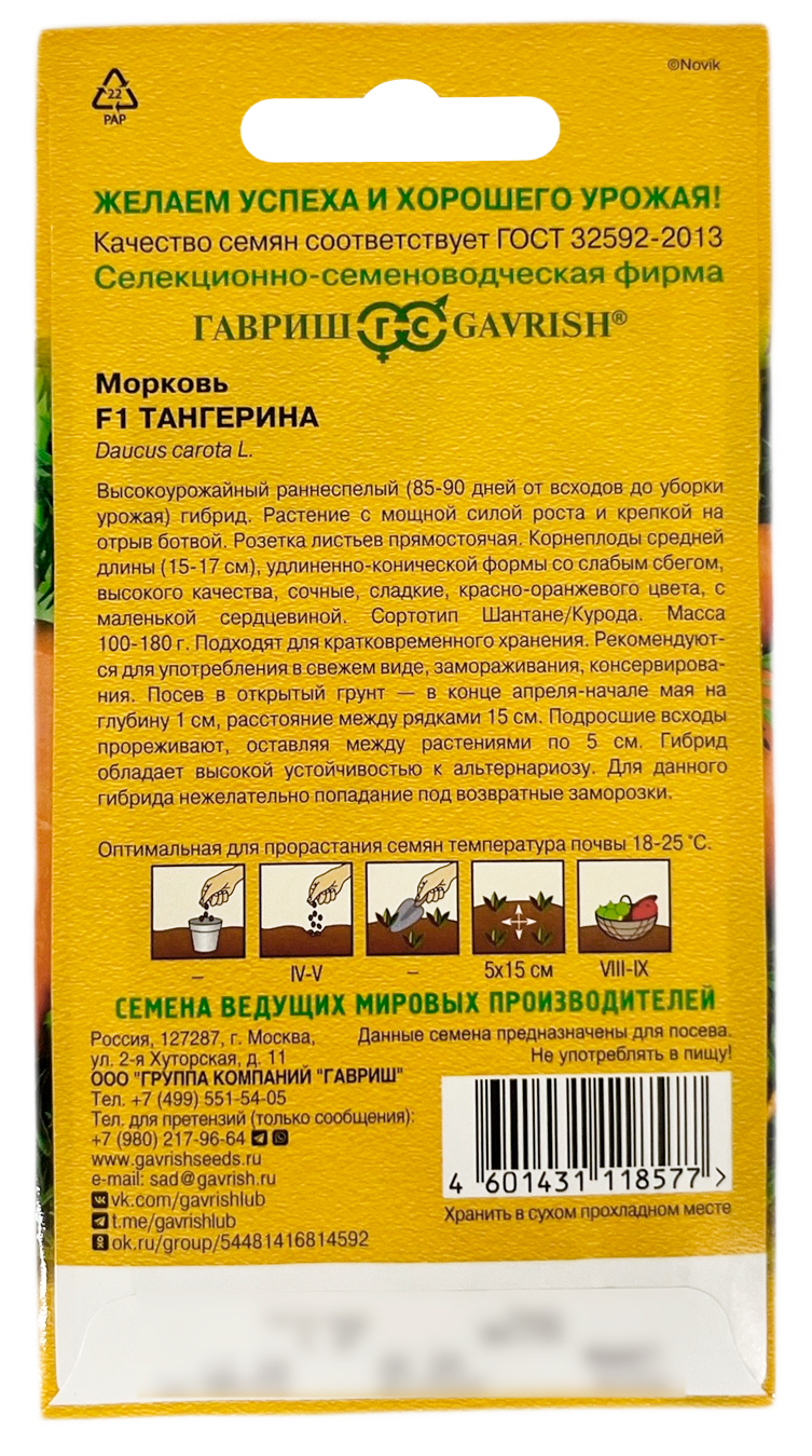Морковь F1 Тангерина ГАВРИШТангерина- высокоурожайный, раннеспелый (от всходов до плодоношения 85-90 дней). Розетка листьев прямостоячая. Растение обладает мощной силой роста и крепкой на отрыв ботвой. Корнеплоды высокого качества, удлиненно-конической формы, со слабым сбегом и слегка заостренным основанием, красно-оранжевого цвета, длиной 15-17 см, массой 180 г, с маленькой сердцевиной и сочной, сладкой мякотью. Рекомендуется использовать в свежем виде, в супах, рагу, пюре, соках, а также для консервирования и замораживания. Подходит для краткосрочного хранения.