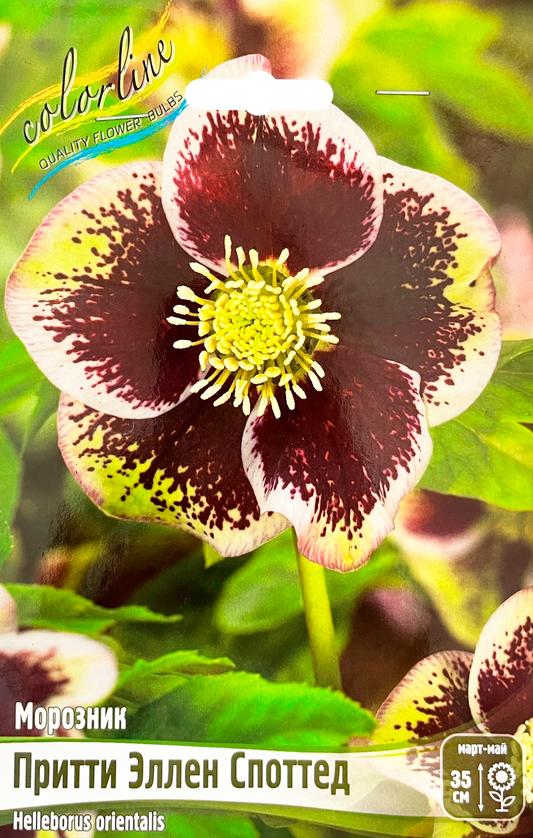 Морозник Притти Эллен СпоттедМорозник Претти Эллен Споттед - вечнозеленый многолетник, достигающий 50 см в высоту и образующий красивые зеленые группы. В начале весны на нем появляются цветки до 5см в диаметре. Цветок - винно-бордовое, очень плотное напыление, светлые бело-желтоватые и зеленоватые края, может повторно зацвести осенью, цветонос на стебле 20-50 см длиной с кожистыми пальчато-рассеченными листьями.