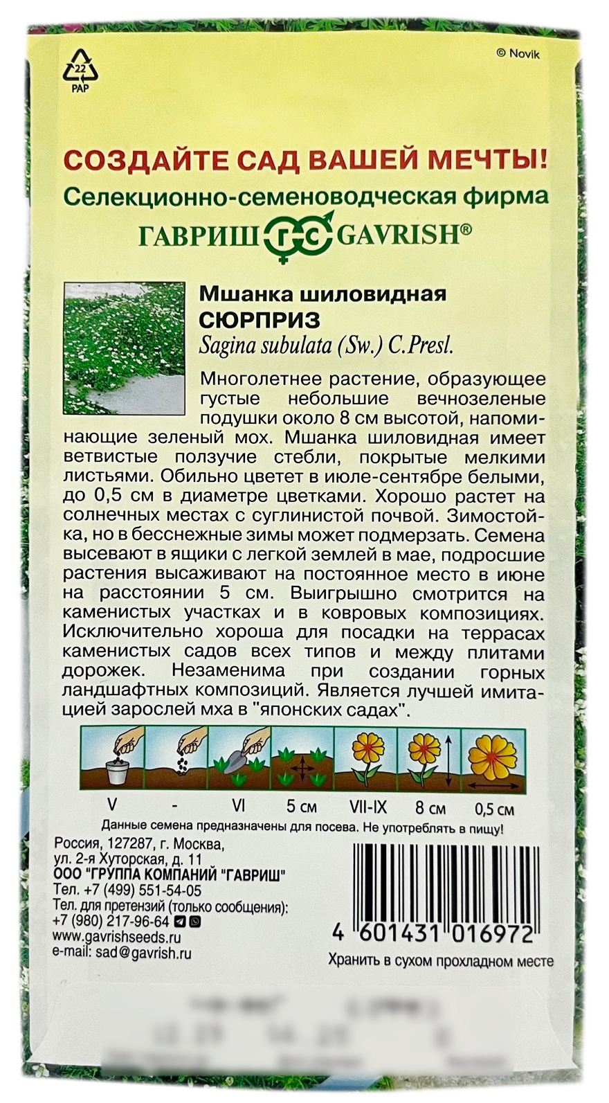 Мшанка шиловидная СЮРПРИЗ ГАВРИШМноголетнее растение, образующее густые, небольшие, вечнозеленые подушки около 8 см высотой, напоминающие зеленый мох. Мшанка шиловидная имеет ветвистые, ползучие стебли покрытые мелкими листьями. Обильно цветет в июле — сентябре белыми до 0,5 см в диаметре, цветками. Хорошо растет на солнечных местах с суглинистой почвой. Зимостойка, но в бесснежные зимы может подмерзать. Семена высевают в ящики с легкой землей в мае, подросшие растения высаживают на постоянное место в июне, на расстоянии 5 см. Выигрышно смотрится на каменистых участках и в ковровых композициях. Исключительно хороша для посадки на террасах каменистых садов всех типов и между плит дорожек. Незаменима при создании горных ландшафтных композиций. Является лучшей имитацией зарослей мха в “японских садах”.