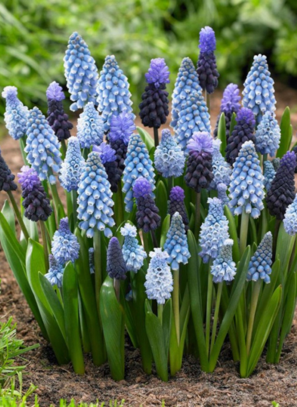 Четыре сорта мускари – белые и различные оттенки синего – зацветают одновременно. Бутоны, напоминающие по форме колокольчики, со сладким ароматом, будут радовать Вас цветением в течение нескольких недель, где бы Вы их не посадили. Становятся крупнее и красивее год от года.