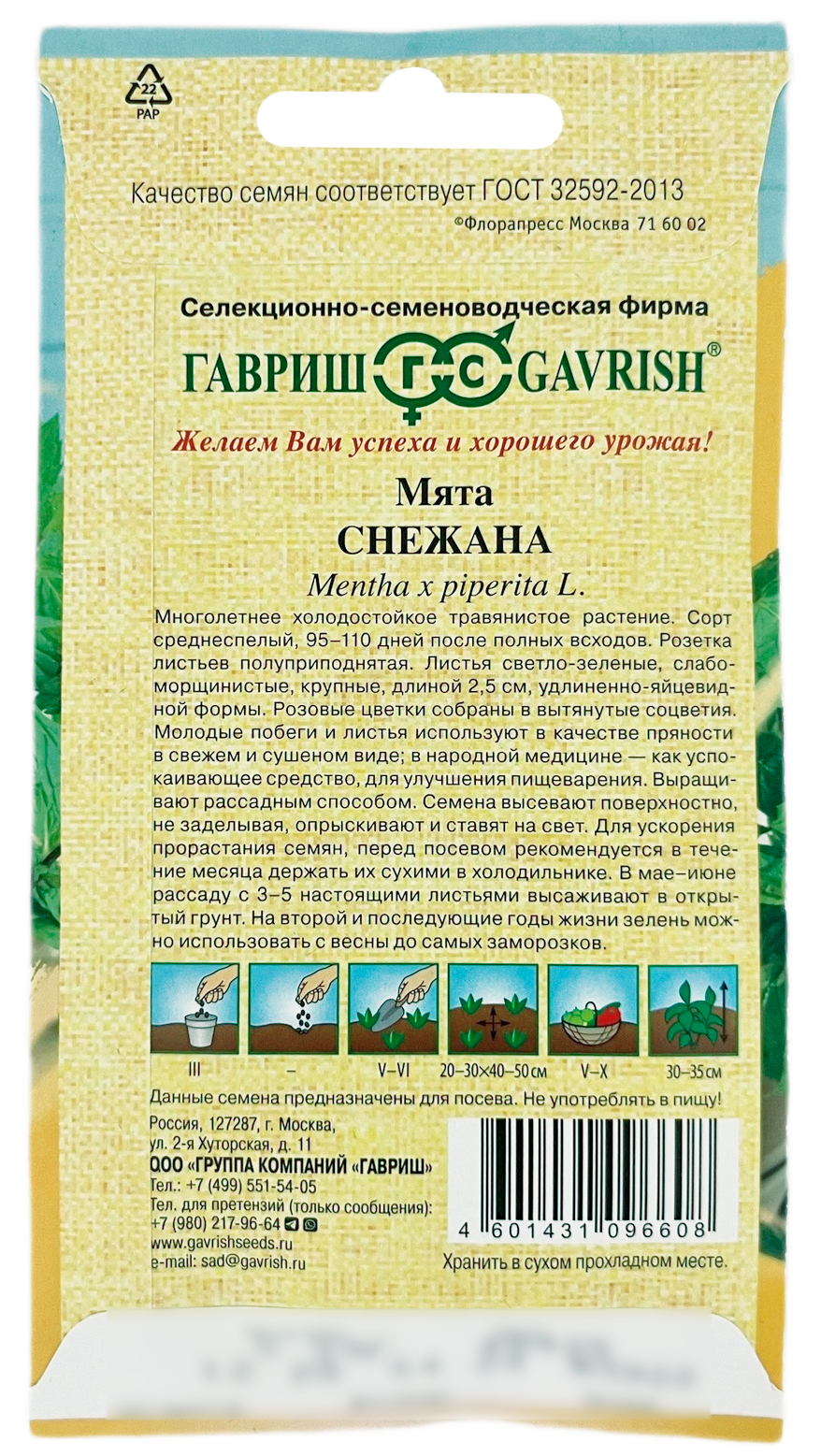 Мята СНЕЖАНА ГАВРИШМноголетнее холодостойкое травянистое растение. Сорт среднеспелый, 95-110 дней после полных всходов. Розетка листьев полуприподнятая. Листья светло-зеленые, слабоморщинистые, крупные, длиной 2,5 см, удлиненно-яйцевидной формы. Розовые цветки собраны в вытянутые соцветия. Молодые побеги и листья используют в качестве пряности в свежем и сушеном виде; в народной медицине — как успокаивающее средство, для улучшения пищеварения. Выращивают рассадным способом. Семена высевают поверхностно, не заделывая, опрыскивают и ставят на свет. Для ускорения прорастания семян, перед посевом рекомендуется в течение месяца держать их сухими в холодильнике. В мае-июне рассаду с 3-5 настоящими листьями высаживают в открытый грунт. На второй и последующие годы жизни зелень можно использовать с весны до самых заморозков.