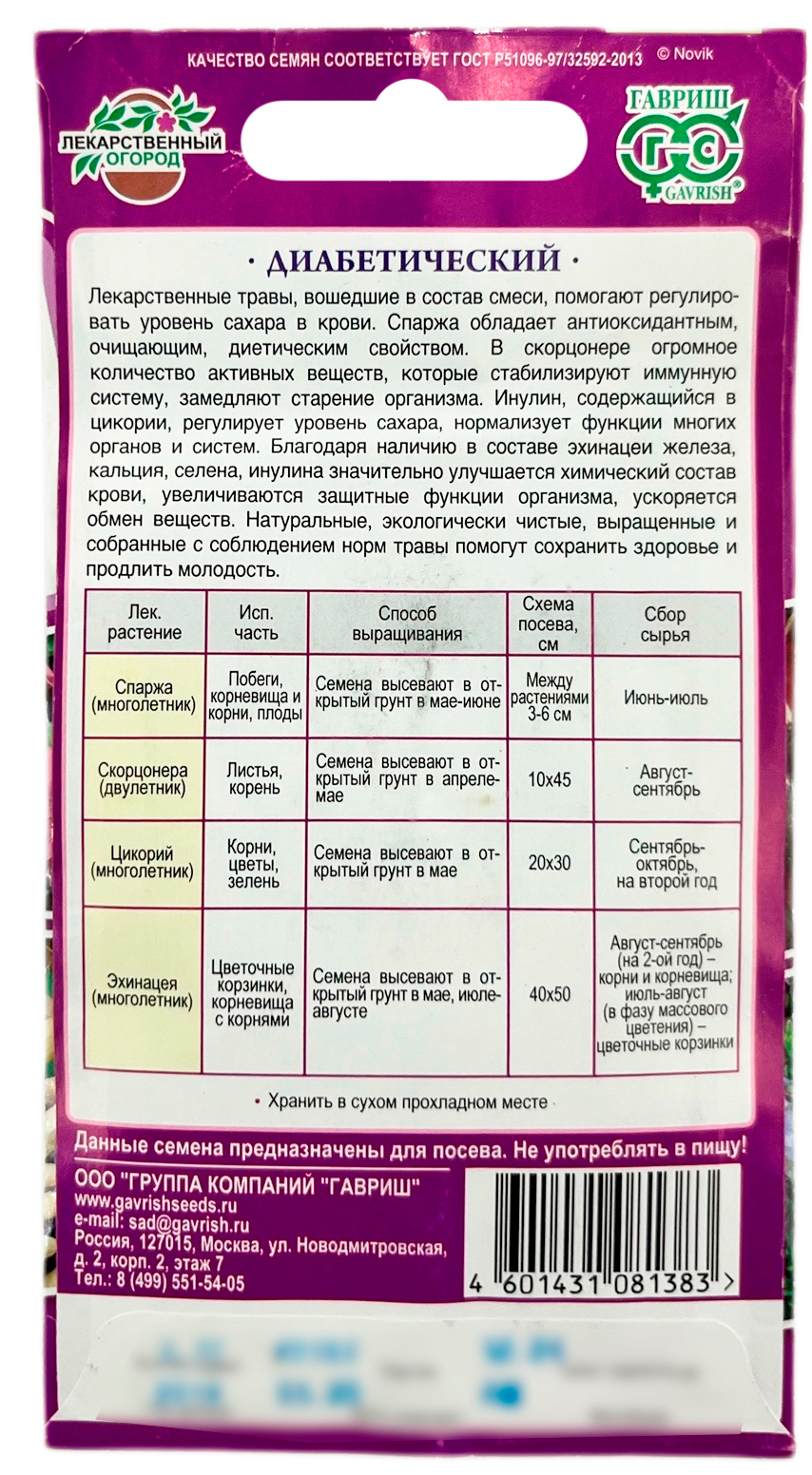 Лекарственный огород Диабетический ГАВРИШЛекарственные травы, вошедшие в состав смеси, помогают регулировать уровень сахара в крови. Спаржа обладает антиоксидантным, очищающим, диетическим свойствами. В скорцонере огромное количество биологически активных веществ, которые стабилизирует иммунную систему, замедляют старение организма. Инулин, содержащийся в цикории, регулирует уровень сахара, нормализует функции многих органов и систем. Благодаря наличию в составе эхинацеи железа, кальция, селена, инулина, значительно улучшается химический состав крови, увеличиваются защитные функции организма, ускоряется обмен веществ. Натуральные, экологически чистые, выращенные и собранные с соблюдением норм травы помогут сохранить здоровье и продлить молодость.