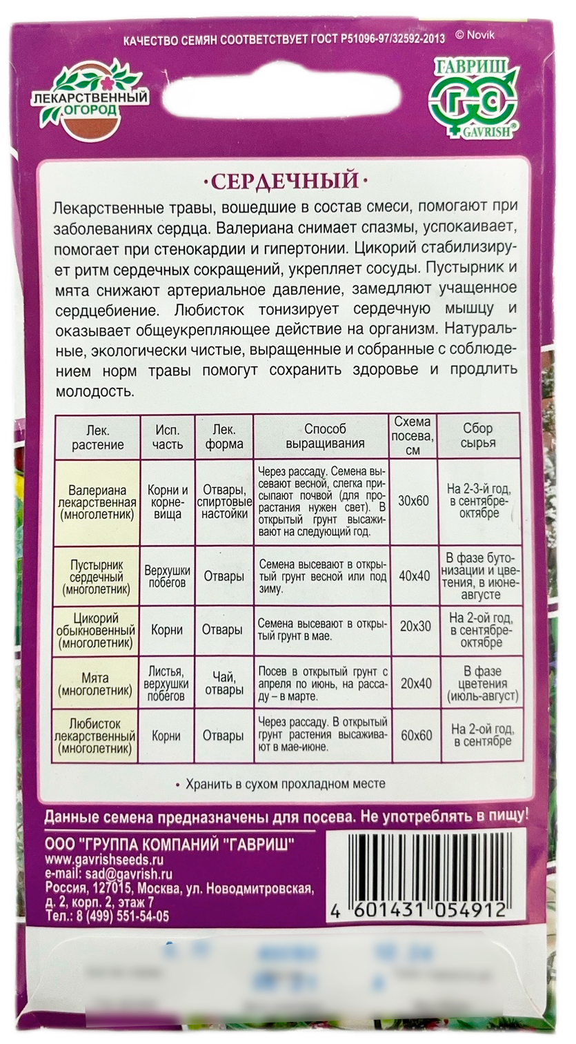 Лекарственный огород Сердечный ГАВРИШЛекарственные травы, вошедшие в состав смеси, помогают при заболеваниях сердца. Валериана снимает спазмы, успокаивает, помогает при стенокардии и гипертонии. Цикорий стабилизирует ритм сердечных сокращений, укрепляет сосуды. Пустырник и мята снижают артериальное давление, замедляют учащенное сердцебиение. Любисток тонизирует сердечную мышцу и оказывает общеукрепляющее действие на организм. Натуральные, экологически чистые, выращенные и собранные с соблюдением норм травы помогут сохранить здоровье и продлить молодость.