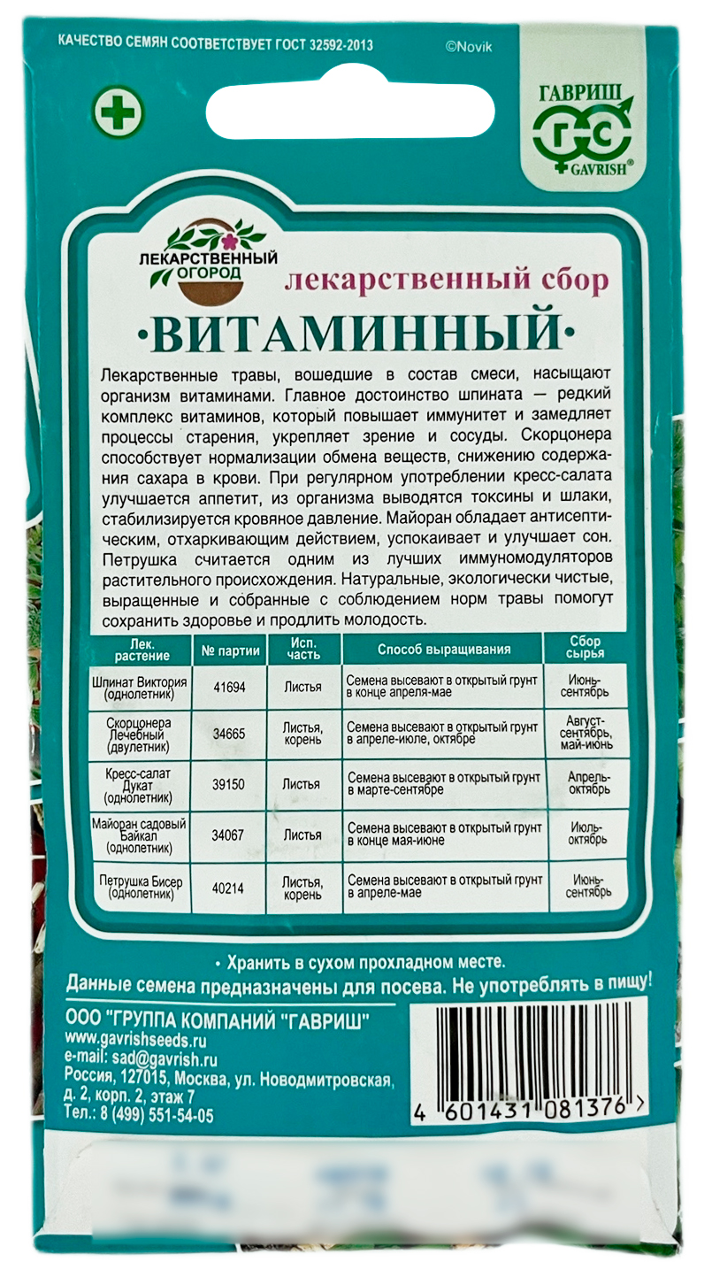 Лекарственный сбор ВИТАМИННЫЙ ГАВРИШЛекарственные травы, вошедшие в состав смеси, насыщают организм витаминами. Главное достоинство шпината — редкий комплекс витаминов, который повышает иммунитет и замедляет процессы старения, укрепляет зрение и сосуды. Скорцонера способствует нормализации обмена веществ, снижению содержания сахара в крови. При регулярном употреблении кресс-салата улучшается аппетит, из организма выводятся токсины и шлаки, стабилизируется кровяное давление. Майоран обладает антисептическим, отхаркивающим действием, успокаивает и улучшает сон. Петрушка считается одним из лучших иммуномодуляторов растительного происхождения. Натуральные, экологически чистые, выращенные и собранные с соблюдением норм травы помогут сохранить здоровье и продлить молодость.