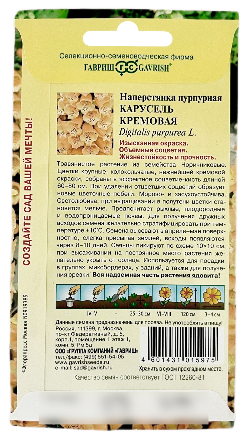 Наперстянка пурпурная КАРУСЕЛЬ КРЕМОВАЯ ГАВРИШТравянистое растение из семейства Норичниковые, высотой 120 см. Цветет в июне-августе. Цветки крупные (длиной 3-4 см) колокольчатые, кремовой окраски, собраны в эффектное соцветие-кисть длиной 60-80 см. При удалении отцветших соцветий образует новые цветочные побеги. Морозо- и засухоустойчива. Светолюбива, при выращивании в полутени цветки становятся мельче. Предпочитает рыхлые, плодородные и водопроницаемые почвы. Выращивают посевом семян в открытый грунт. Всходы появляются на 8-10 день. Сеянцы пикируют по схеме 10х10 см, на постоянное место растения высаживают с расстоянием 25-30 см, молодые растения желательно укрыть. Используется для посадки в группах, миксбордерах, у зданий, а также для получения срезки. Вся надземная часть растения ядовита.