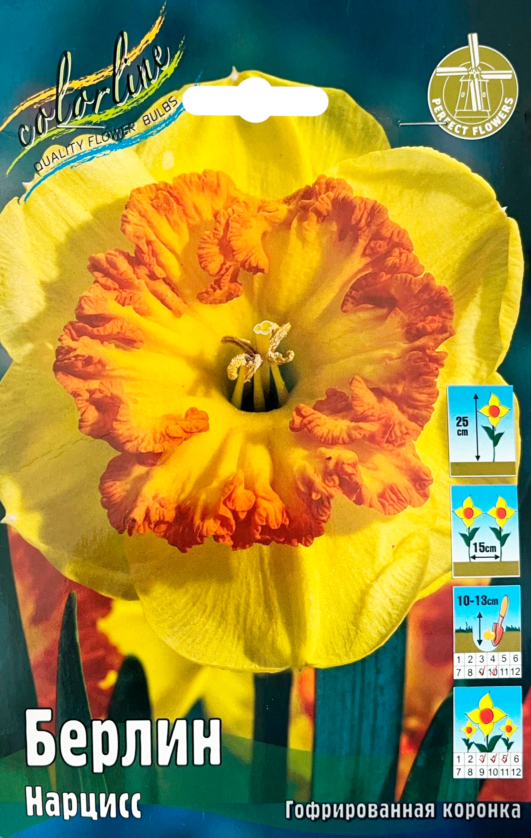 Нарцисс БерлинПрекрасный, как столица Германии, нарцисс (Крупнокорончатый) Берлин. Имеет очень гармоничную расцветку в виде желтого основания цветка и желтой коронки, однако она имеет оранжевую кайму, что придает цветку еще большую изысканность. Аромат у Берлина прекрасный, как и у всех нарциссов. А высота растения – 45 сантиметров. Во время размножения даёт неплохое потомство.
