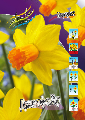 Нарцисс Джетфайр относится к группе крупно-корончатых. Высота растения до 35 см. Цветок: желтый околоцветник, коронка ярко оранжевая, трубчатая. Диаметр цветка около 10 см. Посадка - август - начало сентября. Глубина посадки 15-20 см на расстоянии 10-12 см друг от друга. Цветение начинается с середины мая. К почве особенных требований нет, но при условии, что она хорошо дренирована. Расположение для посадки - солнечные места или полутень. Нарцисс широко используется в озеленении, как раннецветущее растение, в клумбах, рабатках, группах между кустарниками, отдельными пятнами.Характеристики