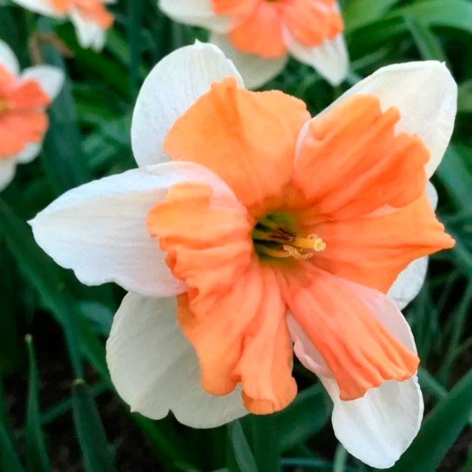 Нарцисс Электрус относится к семейству амариллисовых и характеризуется прекрасными белыми лепестками, окрашенными в оранжево-желтый цвет на концах. Он имеет крупные цветки, которые могут достигать диаметра до 15 сантиметров. Листья нарцисса Электрус ярко-зеленые и ланцетные, создавая красивый контраст с ярким цветком.На растение также характерен приятный, слегка сладковатый аромат, который заполняет воздух во время цветения. Это делает нарцисс Электрус идеальным выбором для создания ароматных букетов и декорирования садовых участков.
