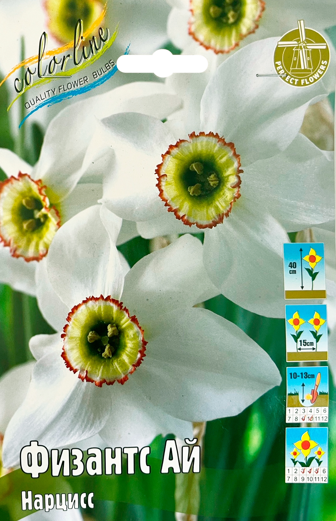 Нарцисс Физантс АйОтносится к группе крупно-корончатых. Высота растения до 40 см. Цветок белый, коронка тёмно-зелёная в центре, по краю-тонкая малиново-красная кайма, диаметр цветка около 10 см. Посадка - август - начало сентября. Глубина посадки 15-20 см, на расстоянии 10-12 см друг от друга. Цветение начинается с середины мая. К почве особенных требований нет, но при условии, что она хорошо дренирована. Расположение для посадки - солнечные места или полутень. Нарцисс широко используется в озеленении, как раннецветущее растение, в клумбах, рабатках, группах между кустарниками, отдельными пятнами.