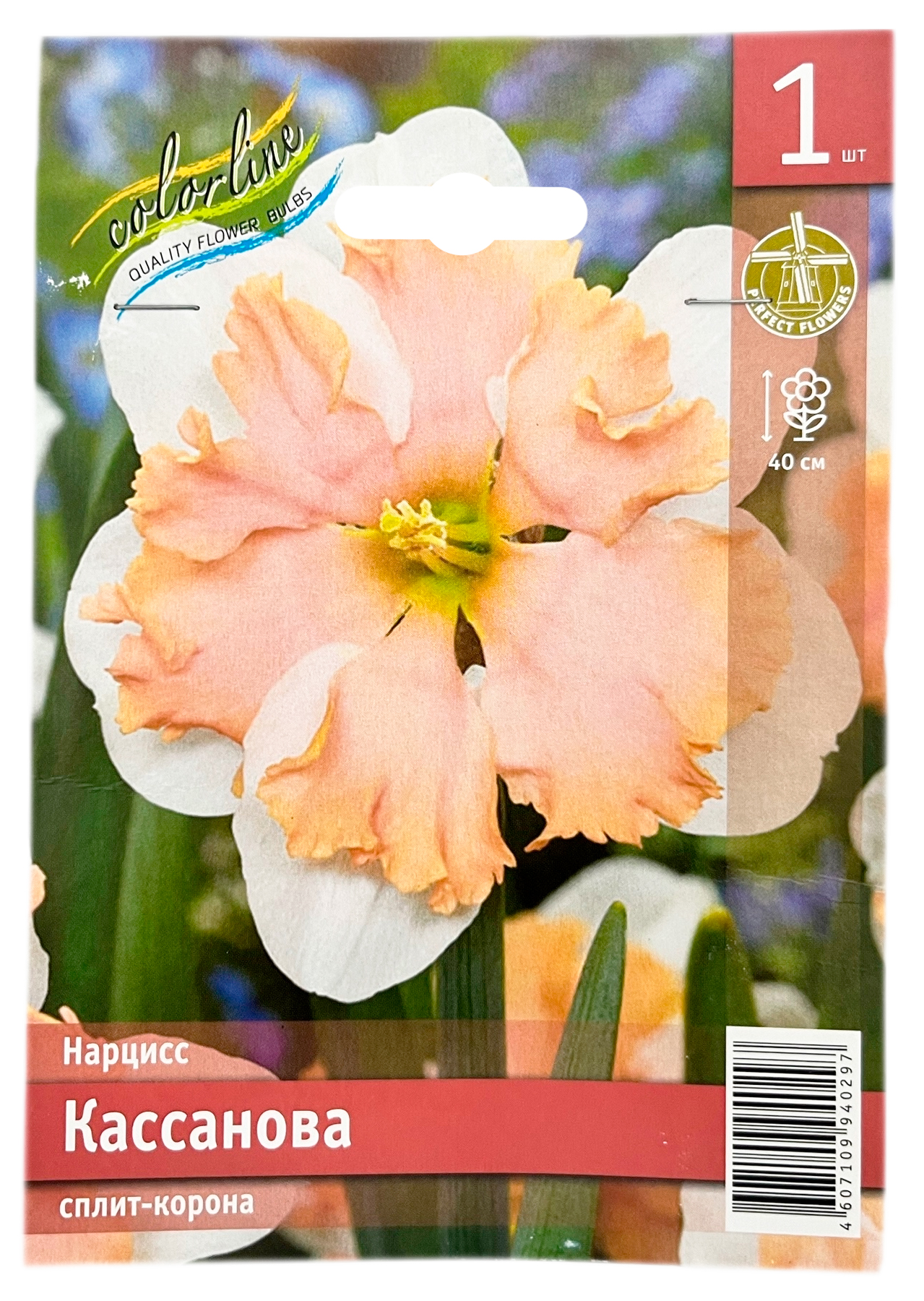 Нарцисс КАССАНОВА сплит-коронаЛепестки белые, коронка большая, гофрированная, розово-абрикосового цвета. Высота до 40 см. Популярное и неприхотливое растение для весеннего украшения сада.
