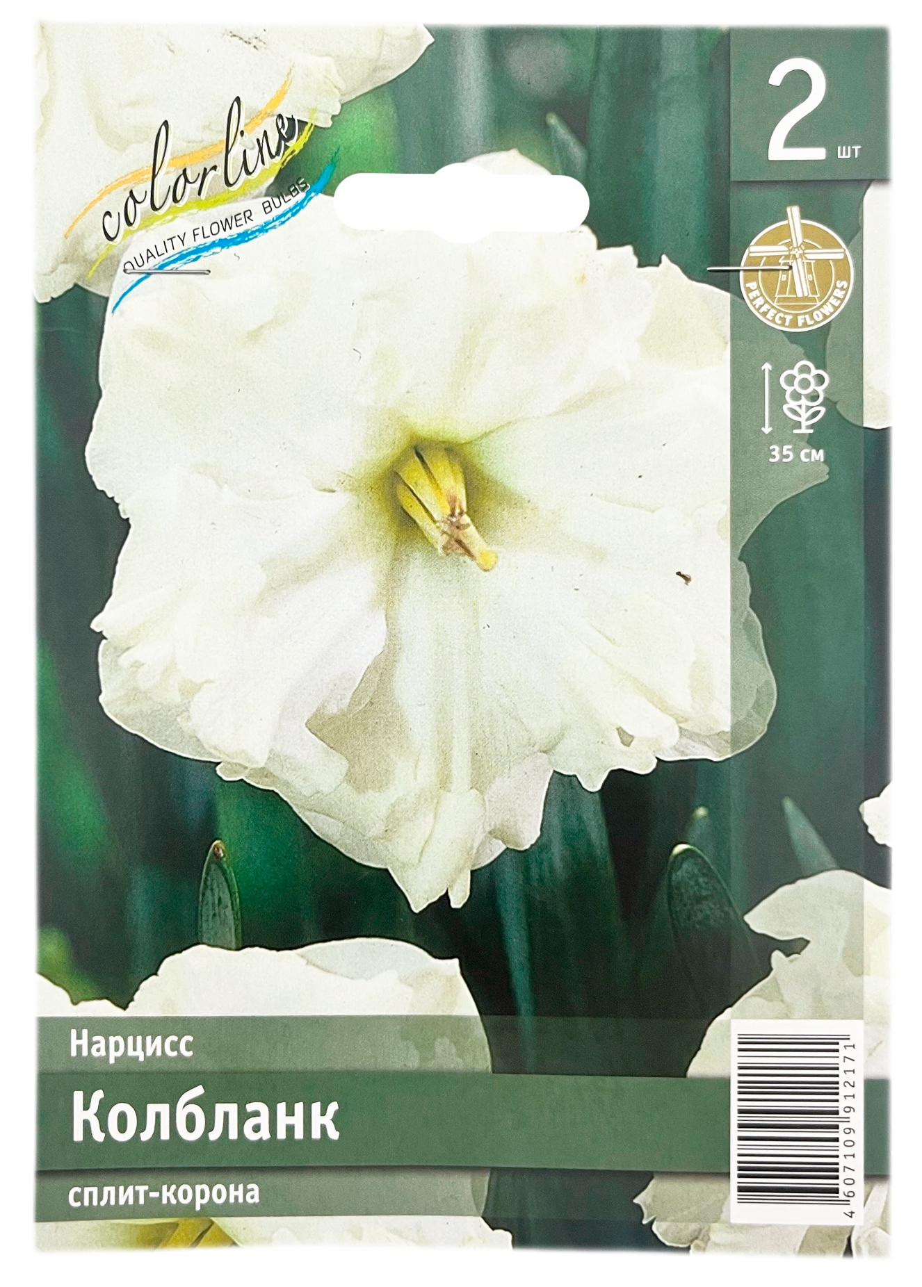 Нарцисс сплит-корона КОЛБЛАНКВысота растения до 35 см. Крупные цветы с белой яркой окраской диаметром до 11 см. Подходит для групповых посадок, создания газона или миксбордеров.