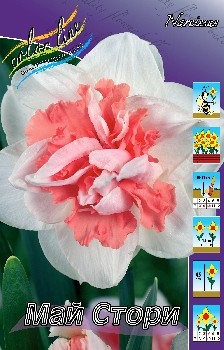 Нарцисс Май Стори относится к группе махровые. Высота растения 45 см. Цветок белый, с розовой густомахровой коронкой. Эксклюзив! Диаметр цветка 10 см. Посадка - август - начало сентября. Глубина посадки 15-20 см на расстоянии 10-12 см друг от друга. Цветение начинается с середины мая. К почве особых требований нет, но при условии что она хорошо дренирована. Расположение для посадки - солнечные места или полутень. Нарцисс широко используется в озеленении, как раннецветущее растение, в клумбах, рабатках, группах между кустарниками, отдельными пятнами.Характеристики