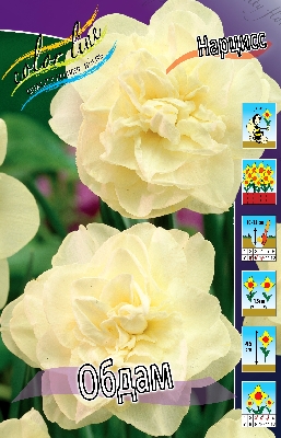 Нарцисс Обдам относится к группе махровые. Цветки с тонким, нежным ароматом, кремово-белого цвета с легким желтоватым оттенком в центре. Размер цветка 10 см. Высота растения 45 см. Посадка - август - начало сентября. Глубина посадки 15-20 см на расстоянии 10-12 см друг от друга. Цветение начинается с середины мая, продолжительностью от 10 дней. К почве особых требований нет, но прив условии что она хорошо дренирована. Расположение для посадки - солнечные места или полутень. Нарцисс широко используется в озеленении, как раннецветущее растение, в клумбах, рабатках, группах между кустарниками, отдельными пятнами.Характеристики