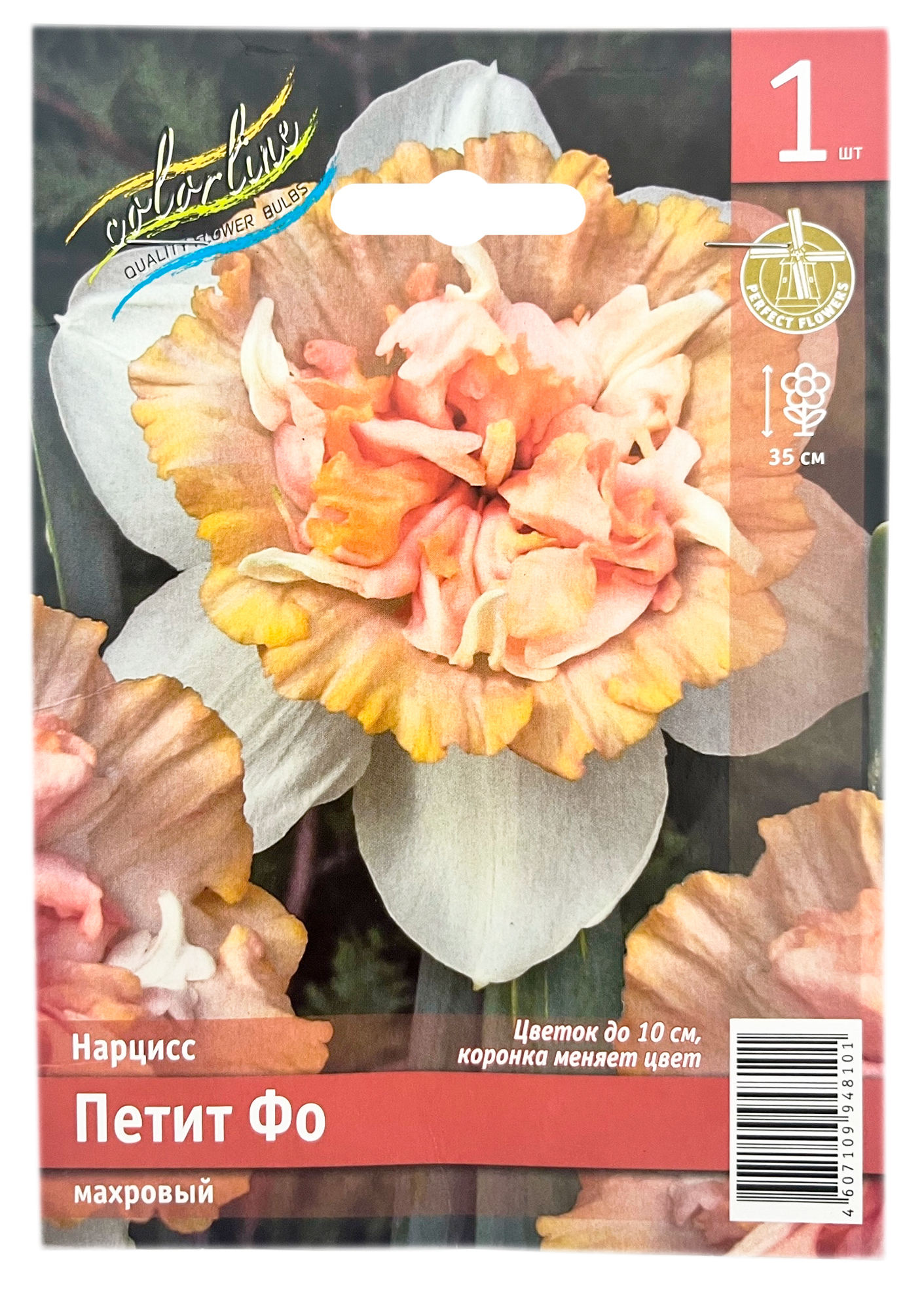 Нарцисс махровый ПЕТИТ ФОМахровые цветы, которые используются для оформления цветников и создания разнообразных букетов. Высота до 35 см, Цветок до 10 см. Окраска может быть как сливочно-белой, так и белоснежной. Коронка обладает кремово-розовой окраской с абрикосовым переливом.