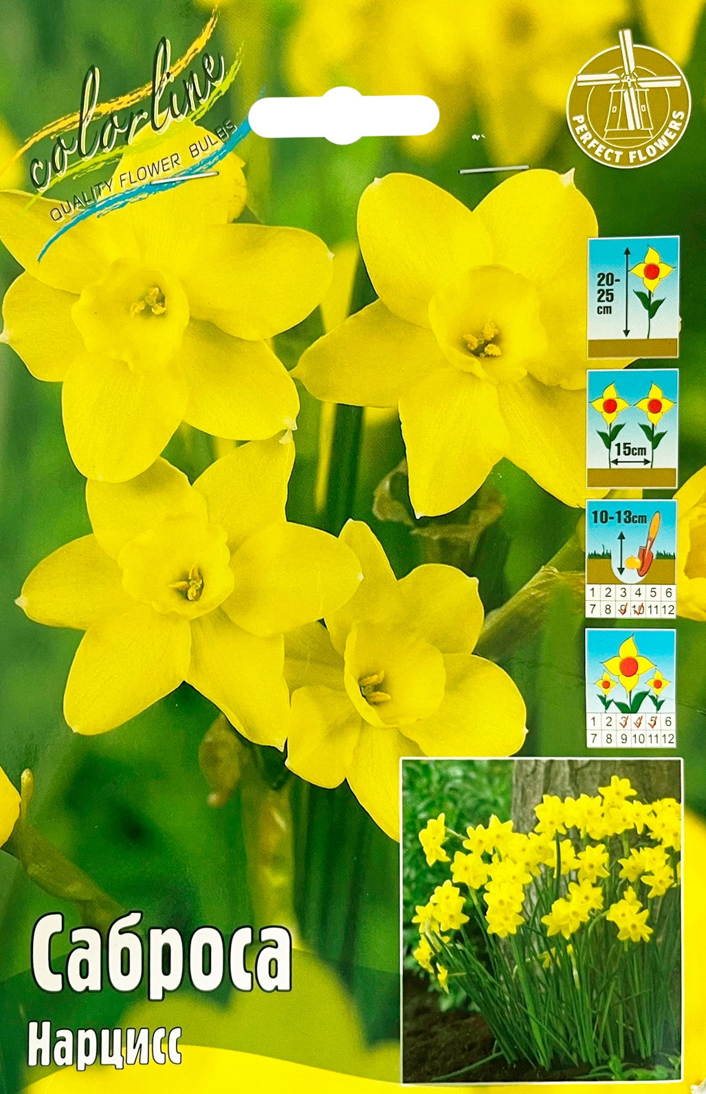 Нарцисс СабросаМиниатюрный, с 2-3 озорными цветочками на цветоносе. Одним из первый распускается в саду. Его часто выращивают в контейнере и обычном цветочном горшке как надёжный выгоночный сорт. Бордюры из многочисленных ароматных звёздочек оживят и преобразят оттаявшие после зимы садовые тропинки и дорожки. Сорт — лауреат многочисленных международных выставок.