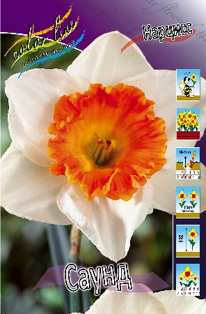Нарцисс Саунд относится к группе крупно-корончатых. Высота растения до 50 см. Цветок белый, коронка желтая с сильногофрированная. ярко-оранжевой каймой. Диаметр цветка около 10 см. Посадка - август - начало сентября. Глубина посадки 15-20 см, на расстоянии 10-12 см друг от друга. Цветение начинается с середины мая. К почве особенных требований нет, но при условии, что она хорошо дренирована. Расположение для посадки - солнечные места или полутень. Нарцисс широко используется в озеленении, как раннецветущее растение, в клумбах, рабатках, группах между кустарниками, отдельными пятнами.Характеристики