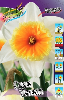 Нарцисс Слим Уитман относится к группе крупно-корончатых. Высота растения до 40 см. Цветок белый, коронка гофрированная, тёмно-жёлтая, со светло-жёлтой каймой. Диаметр цветка около 10 см. Посадка - август - начало сентября. Глубина посадки 15-20 см, на расстоянии 10-12 см друг от друга. Цветение начинается с середины мая. К почве особенных требований нет, но при условии, что она хорошо дренирована. Расположение для посадки - солнечные места или полутень. Нарцисс широко используется в озеленении, как раннецветущее растение, в клумбах, рабатках, группах между кустарниками, отдельными пятнами.Характеристики
