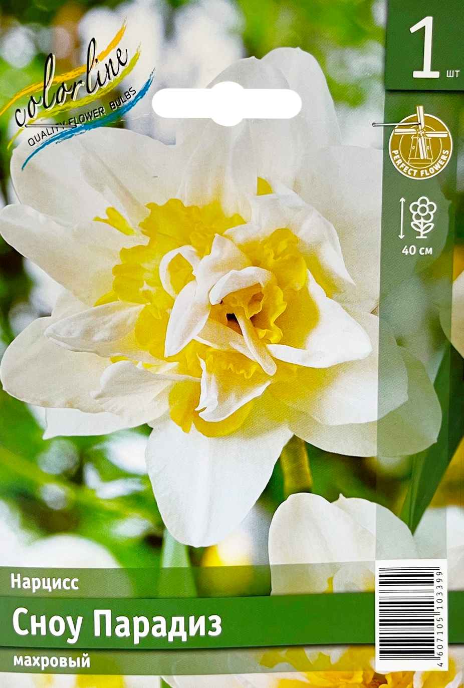 Нарцисс Сноу Парадиз махровыйИзысканный, красивый сорт. Растение высотой до 40 см. Цветок крупный, махровый, белый с нежно-кремово-желтой коронкой.
