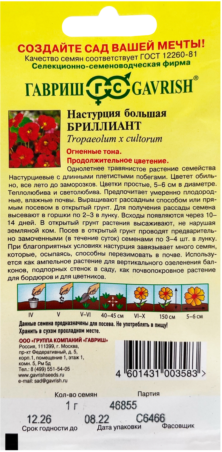 Настурция Бриллиант 1,0 гОднолетнее травянистое растение семейства Настурциевые с длинными плетистыми побегами. Цветет обильно, все лето до заморозков. Цветки простые, 5-6 см в диаметре. Теплолюбива и светолюбива. Предпочитает умеренно плодородные, влажные почвы. Выращивают рассадным способом или прямым посевом в открытый грунт. Для получения рассады семена высевают в горшки по 2-3 в лунку. Всходы появляются через 10-14 дней. В открытый грунт растения высаживают, не нарушая земляной ком. Посев в открытый грунт проводят предварительно замоченными (в течение суток) семенами по 3-4 шт. в лунку. При благоприятных условиях настурция завязывает много семян, которые, осыпаясь, способны перезимовать в почве. Используется как ампельное растение для вертикального озеленения балконов, подпорных стенок в саду, как почвопокровное растение для бордюров и для цветников.