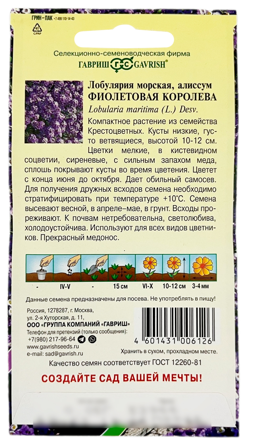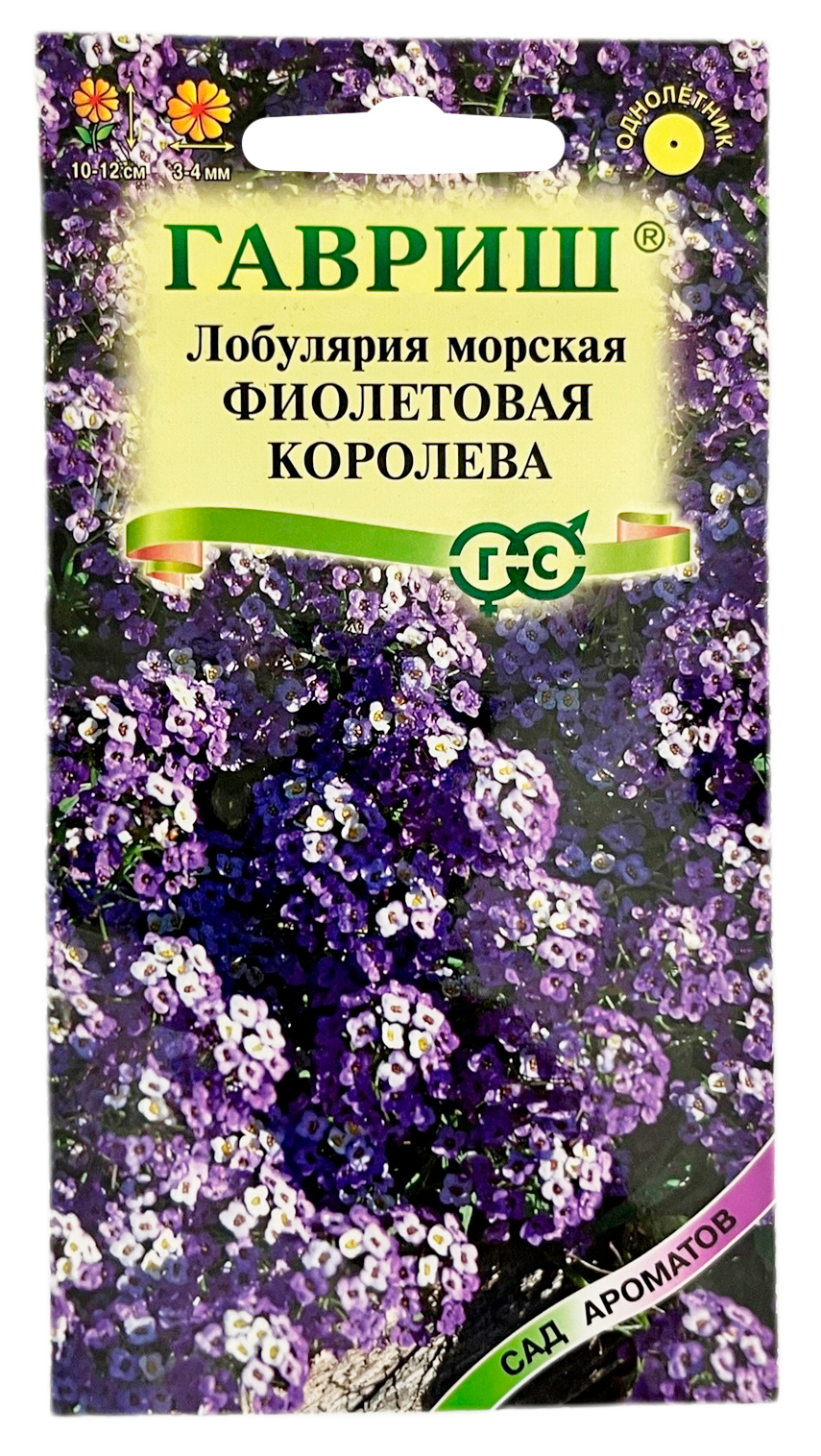 Лобулярия морская Фиолетовая королева ГАВРИШКомпактное растение из семейства Крестоцветных. Кусты низкие, густо ветвящиеся, высотой 10–12 см. Цветки мелкие, в кистевидном соцветии, сиреневые, с сильным запахом меда, сплошь покрывают кусты во время цветения. Цветет с конца июня до октября. Дает обильный самосев. Для получения дружных всходов семена необходимо стратифицировать при температуре +10оС. Семена высевают весной, в апреле–мае, в грунт. Всходы прореживают. К почвам нетребовательна, светолюбива, холодоустойчива. Используют для всех видов цветников. Прекрасный медонос.