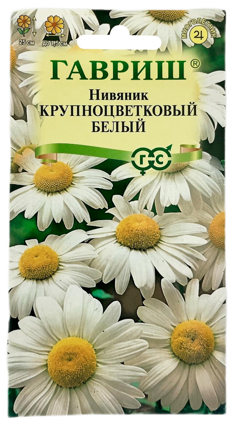 Нивяник Крупноцветковый Белый ГАВРИШМноголетнее растение с множеством ветвистых стеблей высотой от 60 до 100 см. Листья стеблевые, нижние черешковые лопатчатые, верхние продолговатые, сидячие, по краям городчатые. Соцветия - корзинки диаметром 10-12 см. Размножают семенами, делением корневищ и черенками. Семена высевают весной для выращивания рассады или осенью — в гряды открытого грунта. Сеянцы зацветают на второй год. Кусты делят на 3-4-й год выращивания, так как при более длительной эксплуатации растений происходит мельчание соцветий. Деление производят весной, на мелкие части, которые высаживают на расстоянии 30 см. Нивяник хорошо смотрится в групповых посадках на фоне декоративных кустарников, в рабатках, его можно использовать при создании одновидовых групп, которые прекрасно выглядят на газоне, на опушках, около декоративных кустарников. Кроме украшения сада из ромашки получается превосходная срезка.