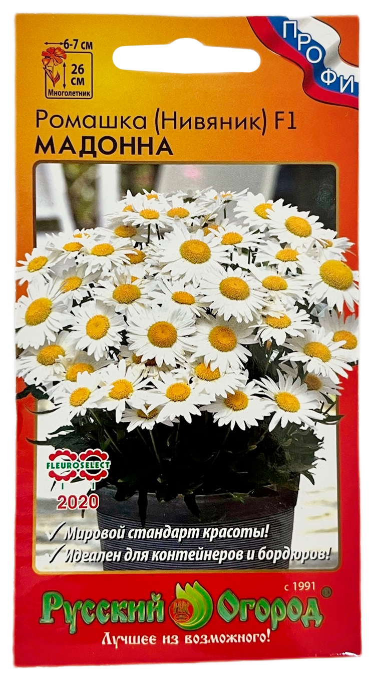 Ромашка Нивяник МАДОННА Русский ОгородНовинка в мире садовых ромашек, золотой медалист Fleuroselect 2020! Компактность, цветение в первый год, великолепный внешний вид - что может быть лучше для небольшого цветника! Данный гибрид достиг пока неперевзойдённых стандартов в высоте и габитусе растения по сравнению с конкурентами. Имеет высокую устойчивость к бактериальным инфекциям.