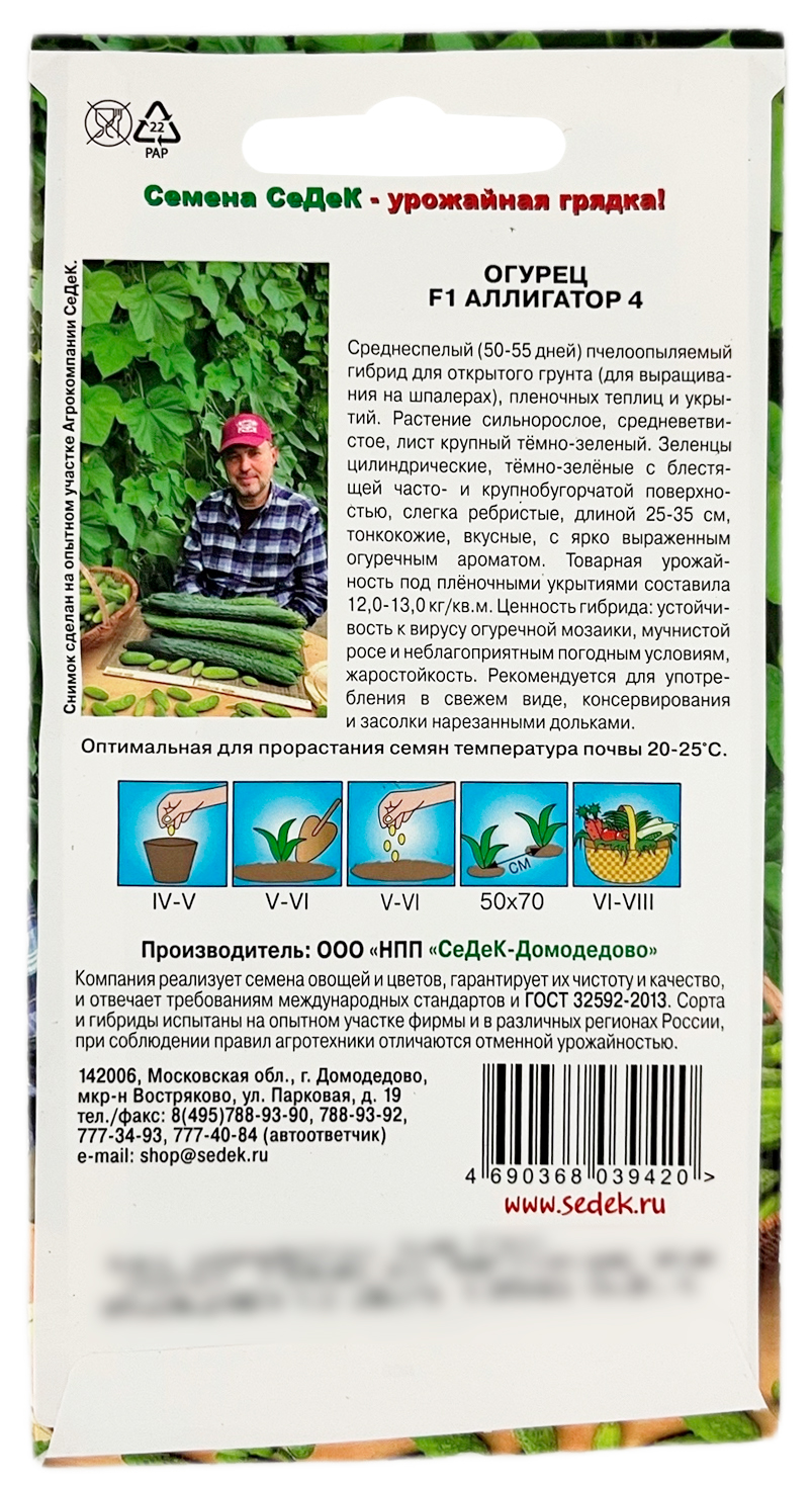 Огурец F1 АЛЛИГАТОР 4 СеДеКСреднеспелый (50-55 дней) пчелоопыляемый гибрид для открытого грунта (для выращивания на шпалерах), пленочных теплиц и укрытий. Растение сильнорослое, средневетвистое, лист крупный тёмно-зеленый. Зеленцы цилиндрические, тёмно-зелёные с блестящей часто- и крупнобугорчатой поверхностью, слегка ребристые, длиной 25-35 см, тонкокожие, вкусные, с ярко выраженным огуречным ароматом. Товарная урожайность под плёночными укрытиями составила 12,0-13,0 кг/кв.м. Ценность гибрида: устойчивость к вирусу огуречной мозаики, мучнистой росе и неблагоприятным погодным условиям, жаростойкость. Рекомендуется для употребления в свежем виде, консервирования и засолки нарезанными дольками.