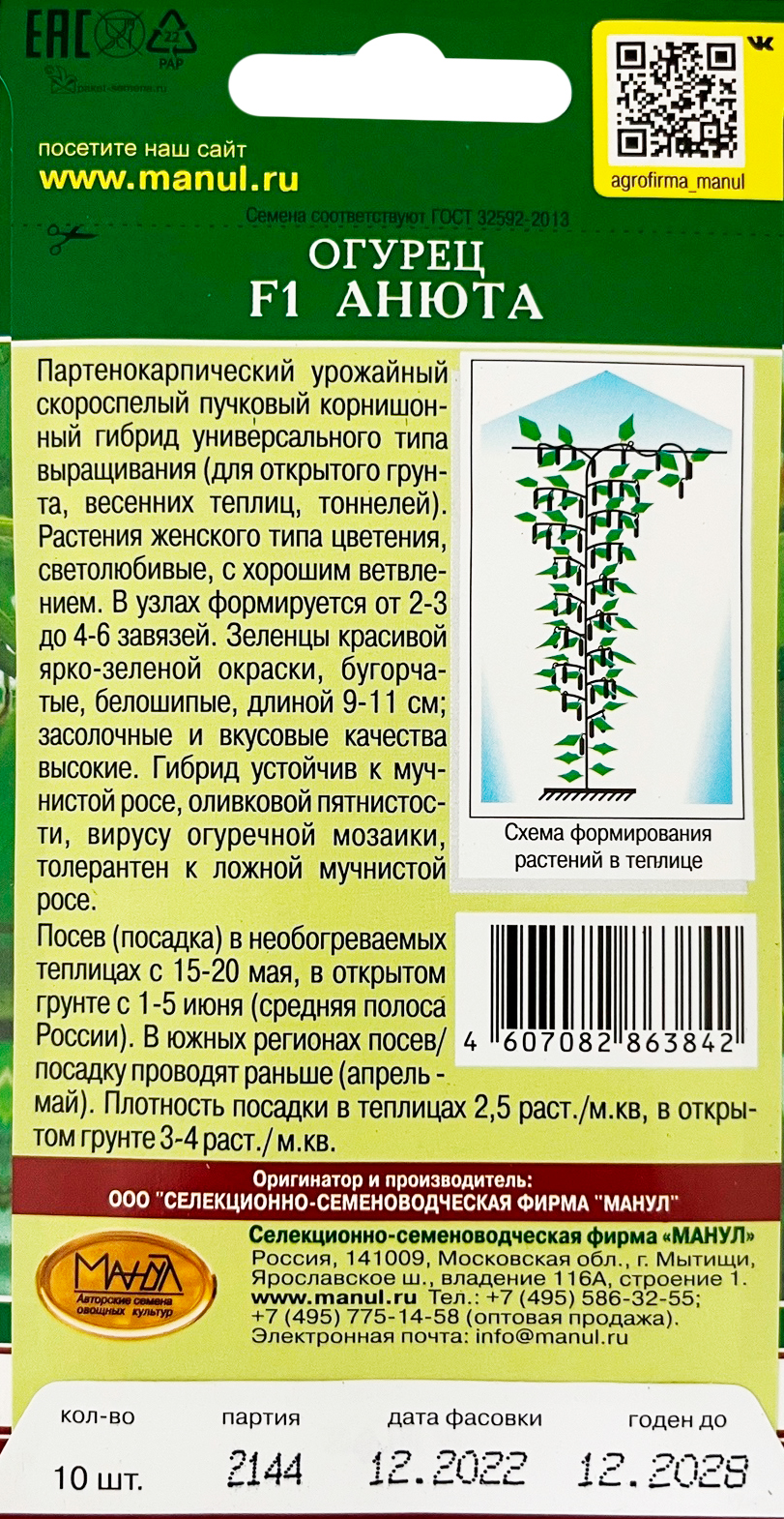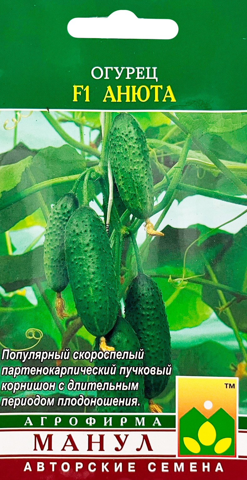 Огурец F1 АнютаПартенокарпический урожайный скороспелый пучковый корнишонный гибрид универсального типа выращивания (для открытого грунта, весенних теплиц, тоннелей). Растения женского типа цветения, светолюбивые, с хорошим ветвлением (2-й тип саморегулирования ветвления). В узлах формируется от 2-3 до 5-6 завязей. Зеленцы красивой ярко-зеленой окраски, длиной 9-12 см, бугорчатые, белошипые, с частым опушением; засолочные и вкусовые качества высокие. Гибрид устойчив к мучнистой росе, оливковой пятнистости, вирусу обыкновенной огуречной мозаики, толерантен к ложной мучнистой росе. Посев (посадка) в необогреваемых теплицах с 15-20 мая, в открытом грунте с 1-5 июня (средняя полоса России). В южных районах посев/посадку проводят раньше (апрель — май). Плотность посадки в теплицах 2,5 раст./м2, в открытом грунте 3-4 раст./м2.