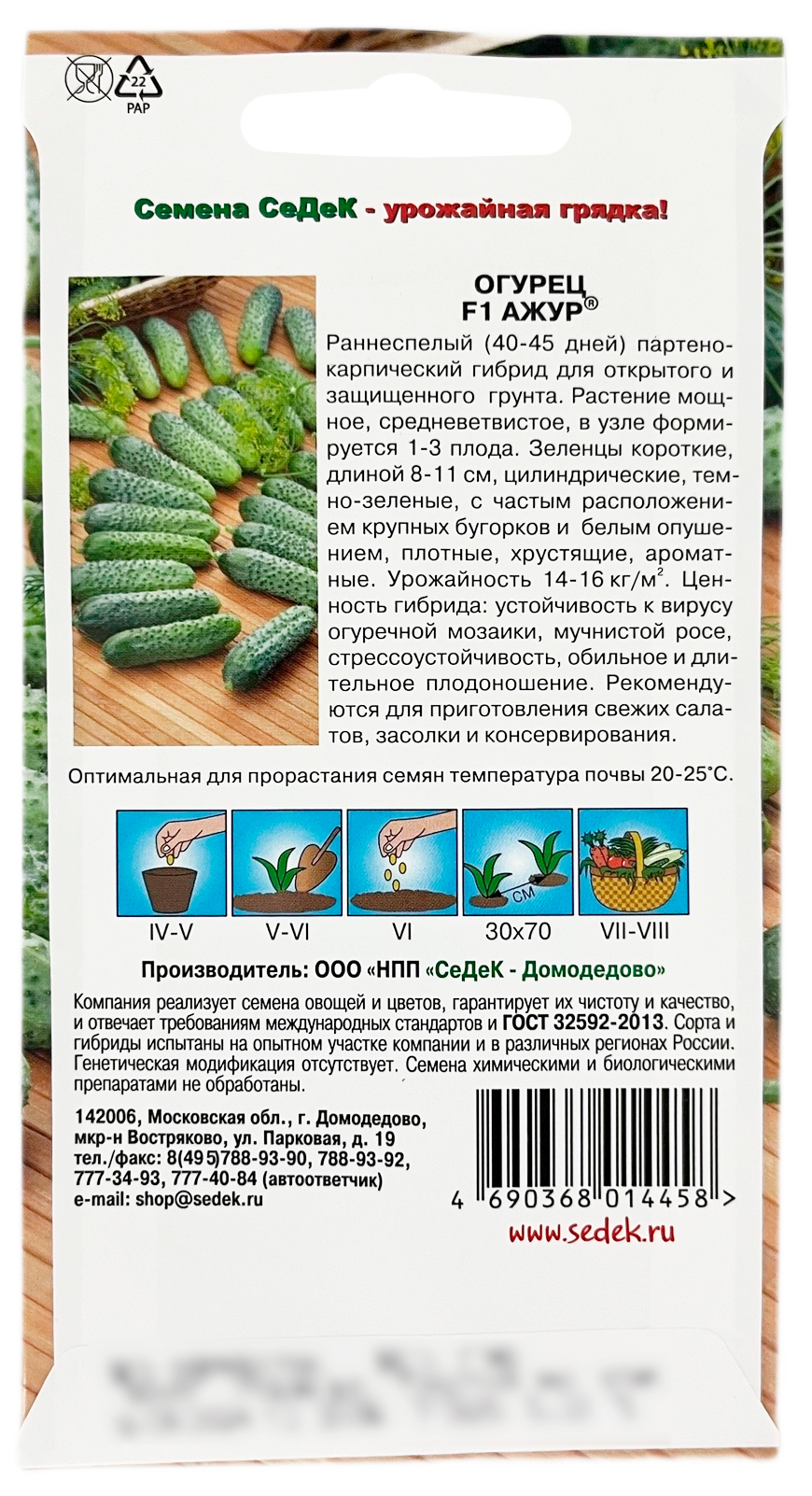 Огурец F1 АЖУР СеДеКРаннеспелый (40-45 дней) партенокарпический гибрид для открытого и защищенного грунта. Растение мощное, средневетвистое, в узле формируется 1-3 плода. Зеленцы короткие, длиной 8-11 см, цилиндрические, темно-зеленые, с частым расположением крупных бугорков и белым опушением, плотные, хрустящие, ароматные. Урожайность 14-16 кг/м². Ценность гибрида: устойчивость к вирусу огуречной мозаики, мучнистой росе, стрессоустойчивость, обильное и длительное плодоношение. Рекомендуются для приготовления свежих салатов, засолки и консервирования.