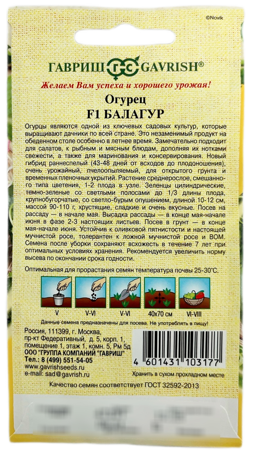 Огурец Балагур F1 ГАВРИШОгурцы являются одной из ключевых садовых культур, которые выращивают дачники по всей стране. Это незаменимый продукт на обеденном столе особенно в летнее время. Замечательно подходит для салатов, к рыбным и мясным блюдам, дополняя их нотками свежести, а также для маринования и консервирования. Новый гибрид раннеспелый (43-48 дней от всходов до плодоношения), очень урожайный, пчелоопыляемый, для открытого грунта и временных пленочных укрытий. Растение среднерослое, смешанного типа цветения, 1-2 плода в узле. Зеленцы цилиндрические, темно-зеленые со светлыми полосами до 1/3 длины плода, крупнобугорчатые, со светло-бурым опушением, длиной 10-12 см, массой 90-110 г, хрустящие, сладкие и очень вкусные. Посев на рассаду — в начале мая. Высадка рассады — в конце мая-начале июня в фазе 2-3-х настоящих листьев. Посев в грунт — в конце мая-начале июня. Устойчив к оливковой пятнистости и настоящей мучнистой росе, толерантен к ложной мучнистой росе и ВОМ. Семена после уборки сохраняют всхожесть в течение 7 лет при оптимальных условиях хранения. Рекомендуется увеличить норму высева по окончании срока годности.