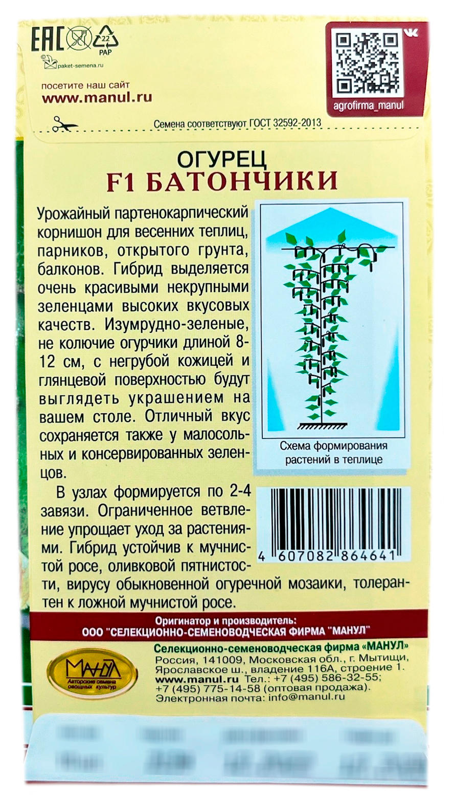 Огурец F1 Батончики МАНУЛУрожайный партенокарпический корнишон для весенних теплиц, парников, открытого грунта, балконов. Гибрид выделяется очень красивыми некрупными зеленцами высоких вкусовых качеств. Изумрудно-зеленые, не колючие огурчики длиной 8-12 см, массой 80-120 г, с негрубой кожицей и глянцевой поверхностью будут выглядеть украшением на вашем столе. Отличный вкус сохраняется также у малосольных и консервированных зеленцов. В узлах формируется по 2-4 завязи. Ограниченное ветвление упрощает уход за растениями. Гибрид устойчив к мучнистой росе, оливковой пятнистости, вирусу обыкновенной огуречной мозаики, толерантен к ложной мучнистой росе.