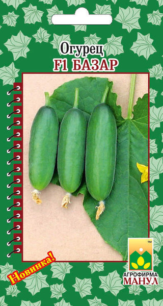 Огурец F1 Базар - гладкоплодный партенокарпический гибрид женского типа цветения сортотипа Кочубей для весенних теплиц, тоннелей, открытого грунта. Ветвление среднее. В узлах формируется по 1-2 завязи. Зеленцы овально-цилиндрической формы, интенсивно-зеленой окраски, с глянцевой поверхностью, длиной 9,5-11 см, диаметром 3,0-3,5 см. Вкусовые качества свежих зеленцов высокие. Гибрид устойчив к оливковой пятнистости, вирусу обыкновенной огуречной мозаики, мучнистой росе, толерантен к ложной мучнистой росе. Плотность посадки в теплицах 2,5 раст./м2, в открытом грунте 3-4 раст./м2.Характеристики