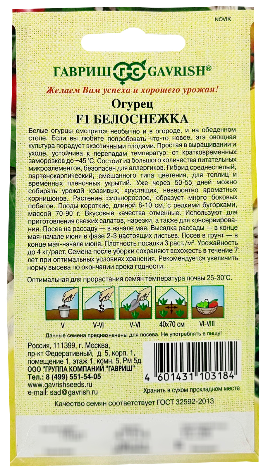 Огурец Белоснежка F1 ГАВРИШБелые огурцы смотрятся необычно и в огороде, и на обеденном столе. Если вы любите попробовать что-то новое, эта овощная культура порадует экзотичными плодами. Простая в выращивании и уходе, устойчива к перепадам температур: от кратковременных заморозков до +45оС. Состоит из большого количества питательных микроэлементов, безопасен для аллергиков. Гибрид среднеспелый, партенокарпический, смешанного типа цветения, для теплиц и временных пленочных укрытий. Уже через 50-55 дней можно собирать урожай красивых, хрустящих, невероятно ароматных корнишонов. Растение сильнорослое, образует много боковых побегов. Плоды короткие, длиной 8-10 см, с редкими бугорками, массой 70-90 г. Вкусовые качества отменные. Используют для приготовления свежих салатов, нарезки, а также для консервирования. Посев на рассаду — в начале мая. Высадка рассады — в конце мая-начале июня в фазе 2-3-х настоящих листьев. Посев в грунт — в конце мая-начале июня. Плотность посадки 3 раст/м2. Урожайность до 4 кг/раст. Семена после уборки сохраняют всхожесть в течение 7 лет при оптимальных условиях хранения. Рекомендуется увеличить норму высева по окончании срока годности.