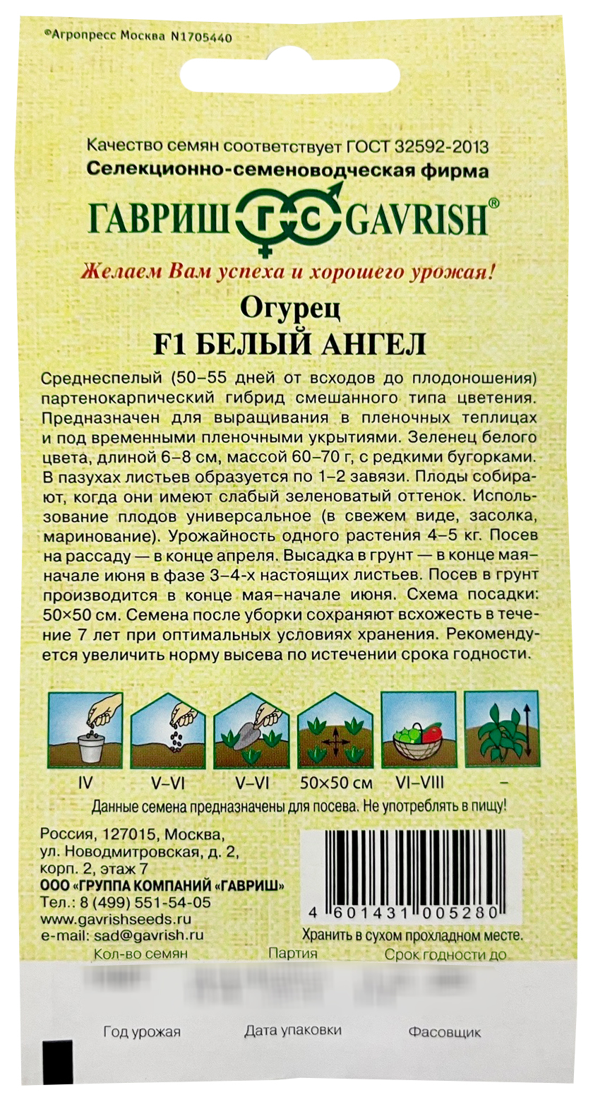 Огурец F1 Белый ангел ГАВРИШНовый среднеспелый гибрид (50-55 дней от всходов до плодоношения) с высокой степенью партенокарпии, смешанного типа цветения, предназначен для выращивания, в пленочных теплицах и под временными пленочными укрытиями. Растения сильнорослые, образуют много боковых побегов. В пазухах листьев образуется по 1-2 завязи. Плоды короткие (6-8 см) необычной для огурца белой окраски, с редкими бугорками. Плоды следует собирать, когда они приобретают слабый зеленоватый оттенок. Употребляют плоды, как в свежем виде, так и в консервированном. Плотность посадки 3 раст/м2. Урожайность до 4 кг/раст.